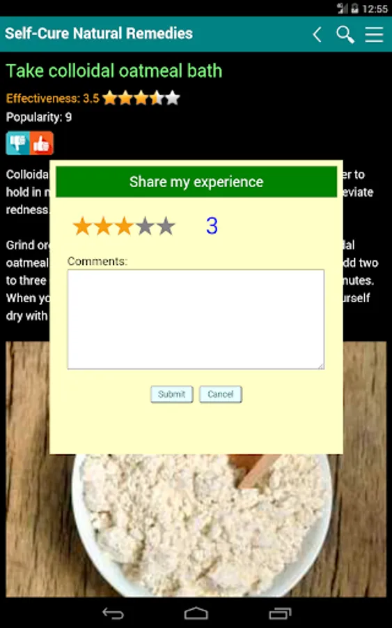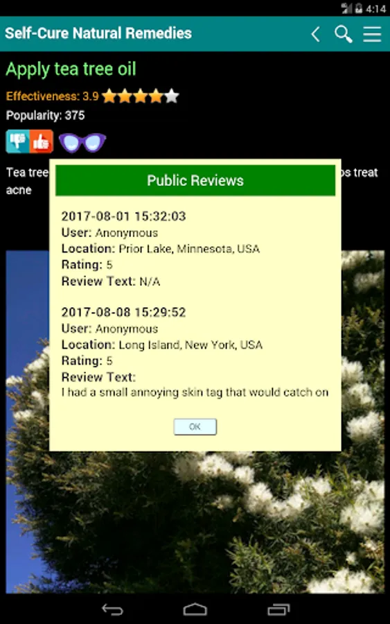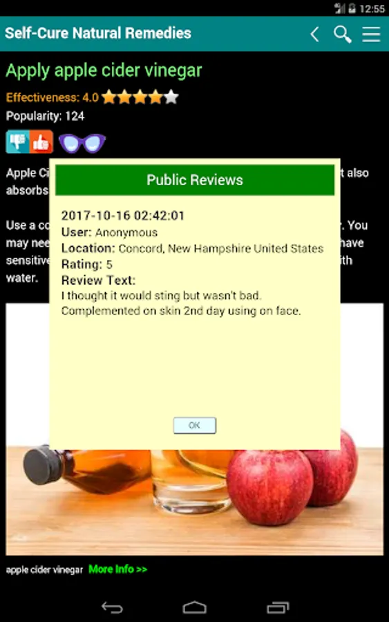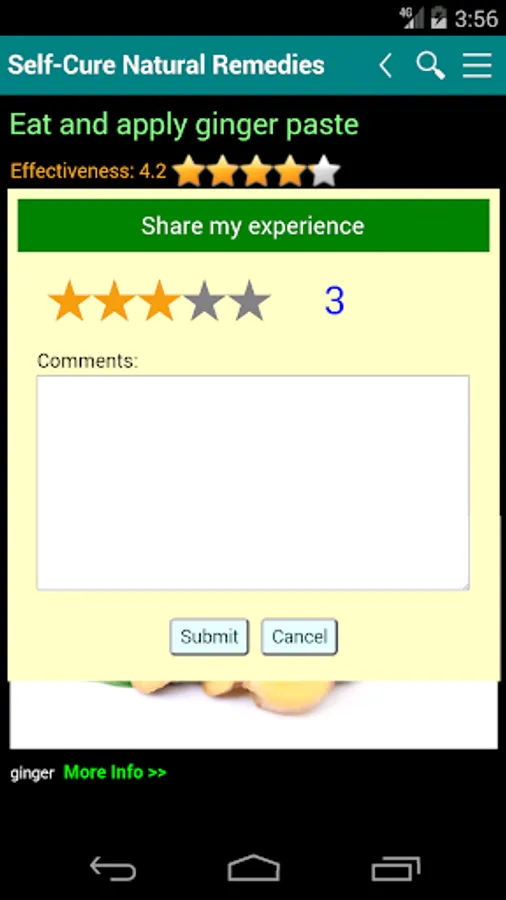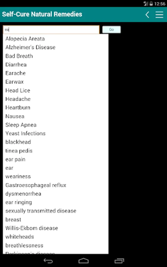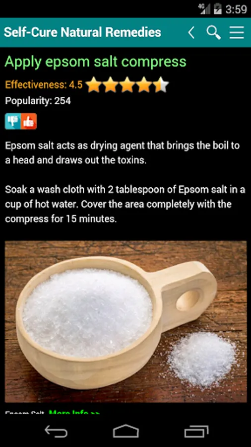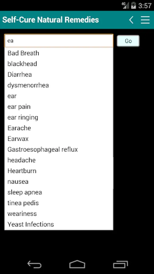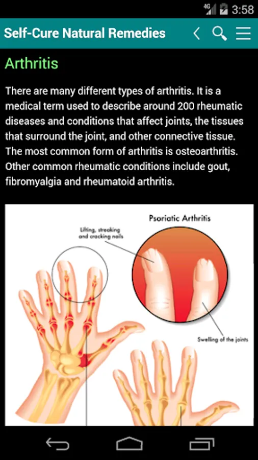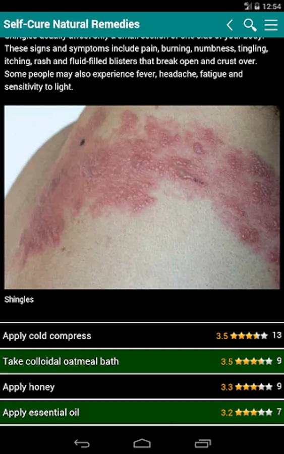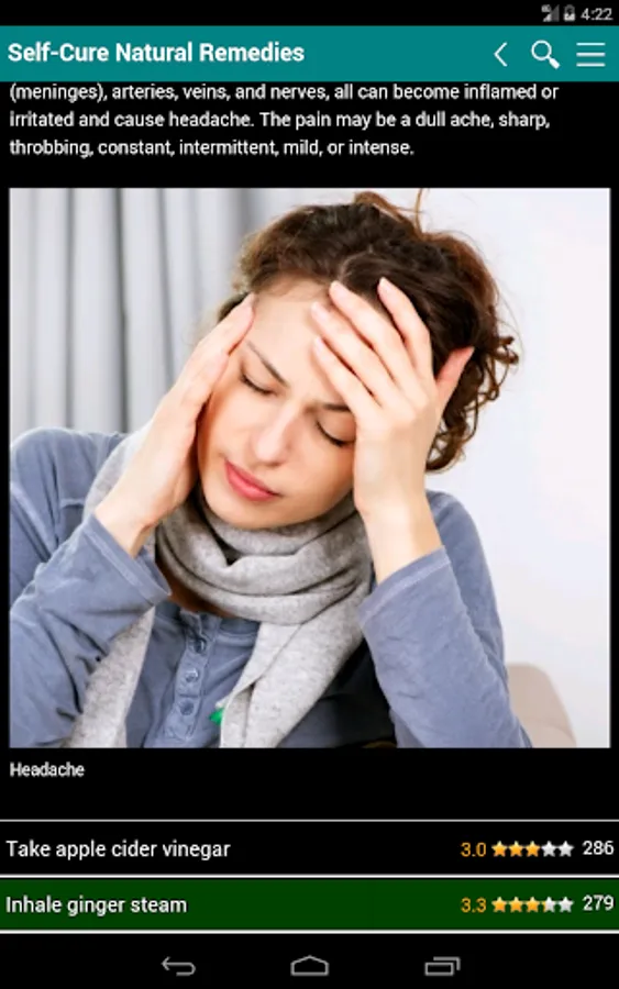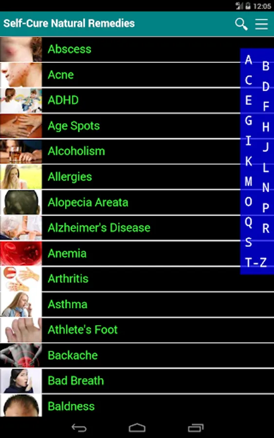 The home remedies section of the App currently includes 1400+ remedies for 100+ ailments and illness. These numbers are also growing every day, thanks to the helps from the community. The diseases, disorders, conditions, symptoms, ailments, illnesses and sicknesses currently covered by the App include abdominal pain, Abscess, acid reflux, Acne, ADD, ADHD, Age Spots, alcohol addiction, Alcoholism, allergy, hair loss, Alzheimer's Disease, Anemia, Arthritis, Asthma, Athlete's Foot, Backache, Bad Breath, bald, Bedwetting, bed-wetting, Bee Sting, bellyache, Black Eye, blackhead, bleeding gum, Blisters, blood, Blood circulation, blood sugar, Body Odor, Boil, breathlessness, Bronchitis, Bruises, bump, Burns, Canker Sores, carbuncle, Cataract, Chapped Lips, chest tightness, Chickenpox, Cloudy vision, cold, Cold Sores, Conjunctivitis, Constipation, contusions, Corn, Cough, cramp, Dandruff, Dementia, dental pain, Depression, Diabetes, Diaper Rash, Diarrhea, Dry Skin, ear, ear pain, ear ringing, Earache, Earwax, Eczema, ED, Enlarged Prostate, impotence, Tremor, fart, Fatigue, feet pain, Fever, fever blisters, Flatulence, Flu, fungi, Herpes, GERD, Gingivitis, Gray Hair, Hair Loss, halitosis, hand tremors, Hangover, hard stool, Hay Fever, Head Lice, Headache, Heartburn, heel pain, Hemorrhoids, herpes, Hiccups, High Blood Cholesterol, High Blood Pressure, Hives, Hoarseness, hypertension, Hypoglycemia, IBS, impotence, Indigestion, influenza, insect bite, Insomnia, Intestinal Parasites, Irritable Bowel Syndrome, itching, Jet Lag, joint pain, Kidney Stones, Knee Pain, Laryngitis, liver spots, loose stool, lower back pain, Menstrual Cramps, Small breast, Migraine, Morning Sickness, Motion Sickness, mouth ulcer, muscle contraction, Muscle Cramp, Nasal Congestion, Nausea, Neck Pain, neck strain, Nosebleed, obesity, Overweight, pain, parasite, Parkinson's disease, piles, pimple, pink eye, pinkeye, PMS, Psoriasis, pus, rash, RLS, runny nose, nerve pain, Shaky Hands, Sinus infection, Sinusitis, sleep disorder, sleeplessness, snore, Snoring, Sore Throat, spider veins, STD, stomach pain, parasite, Stress, stuffy nose, sun spots, Sunburn, tension, tinnitus, fungi, Toothache, travel sickness, UTI, Vaginal Odor, Varicose Veins, vomit, wheezing and Yeast Infections.