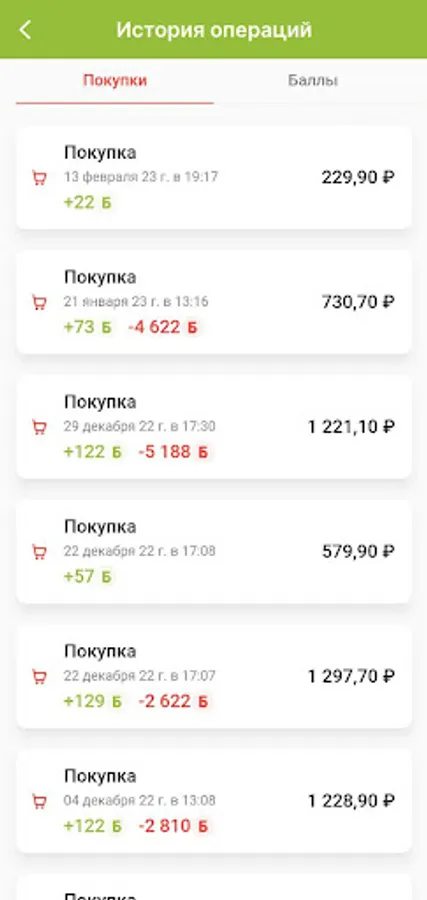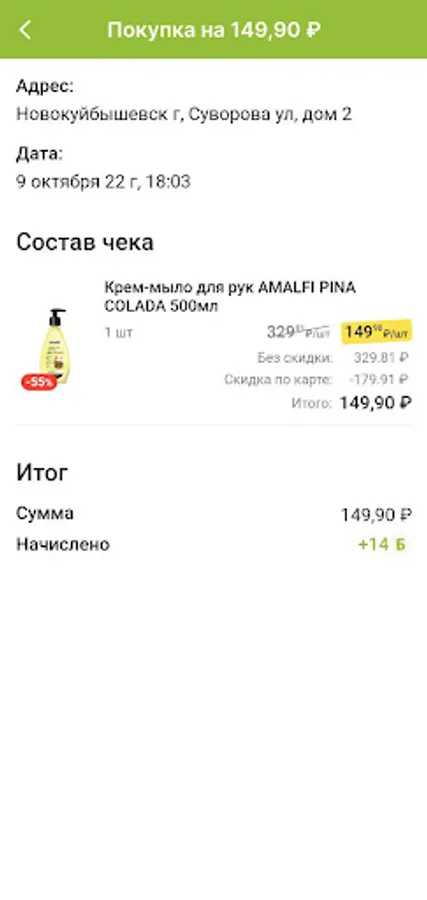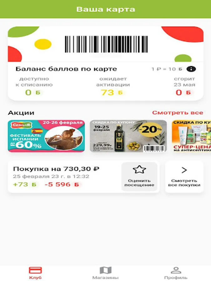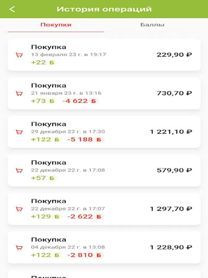 Points balance. For every purchase with a loyalty card, you get cashback. Keeping track of accruals and write-offs of points has become much easier.