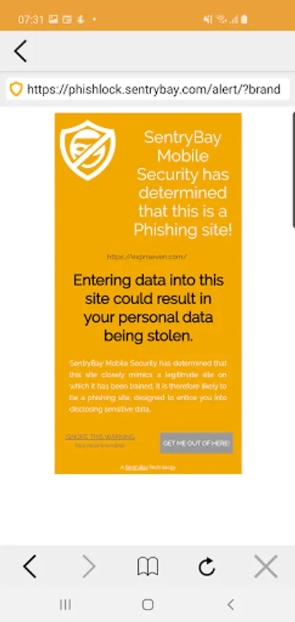 SentryBay Mobile Security protects you against the risk of being directed to phishing websites from which your data could be stolen. It works every time you browse the Internet using the SentryBay Mobile Security application - which includes its own secure browser. If you accidentally visit a phishing page, you will receive an alert to warn you of the potential danger.