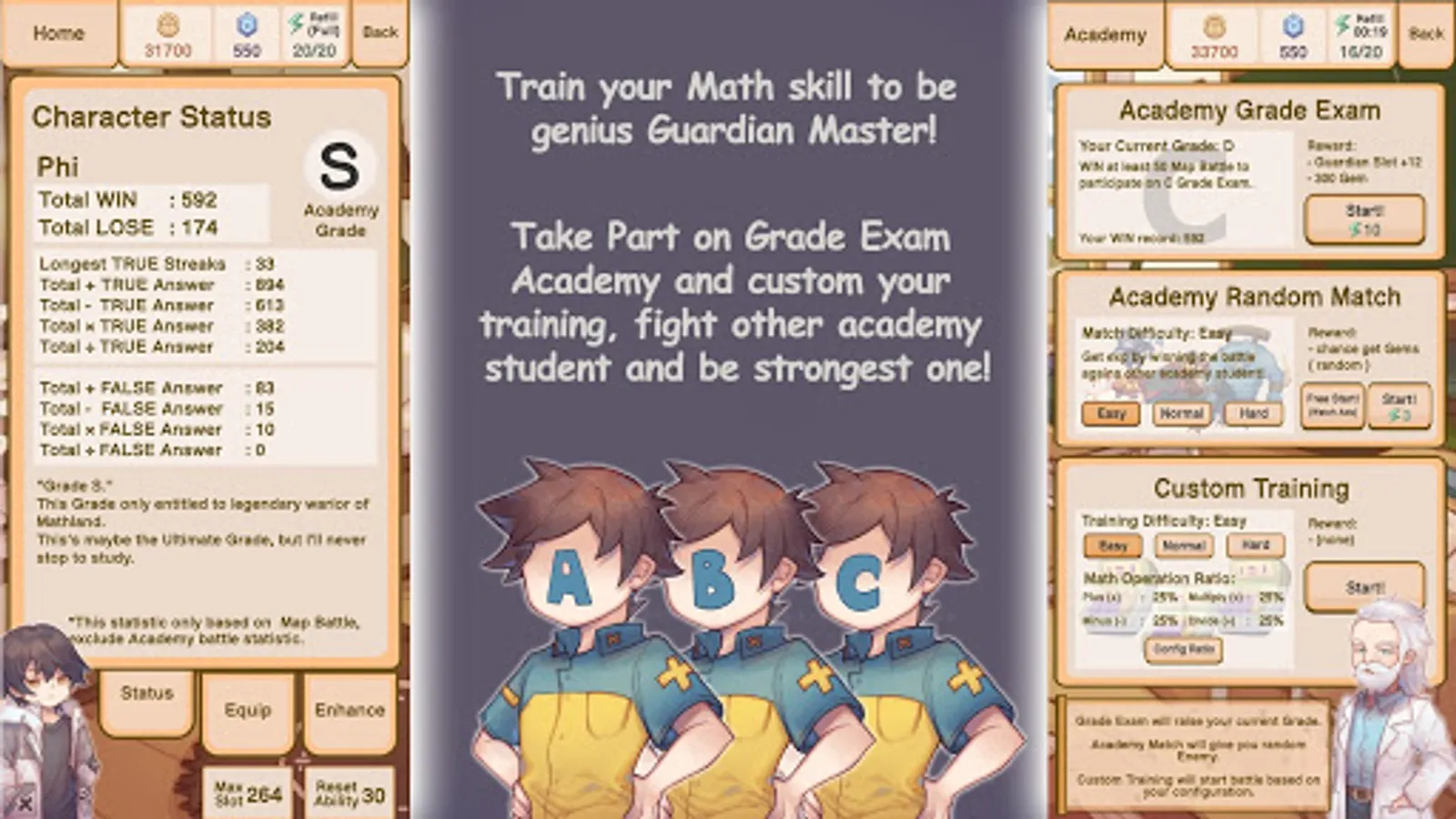Play as Phi, a student from Math Academy that appears as "E" Class Student, lowest Grade student, chosen by one most powerful "Legendary Binary Emperon".