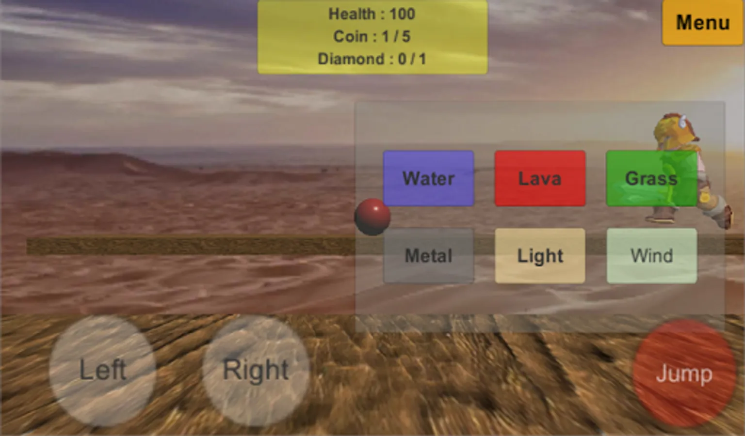 - Player can change state into grass, lava, water, metal, wind, or light