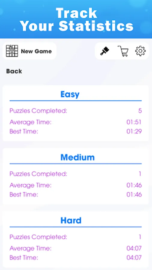 - Statistics. Track your progress for each difficulty level: analyze your best time and other achievements