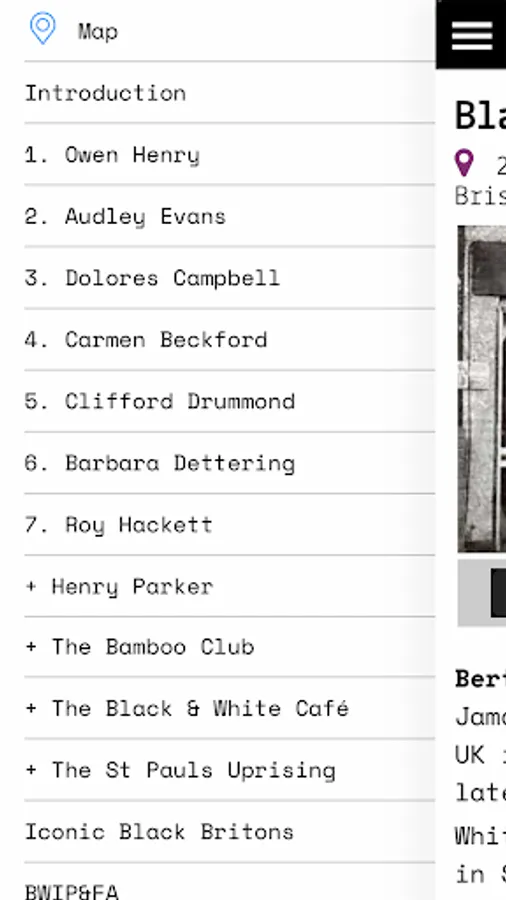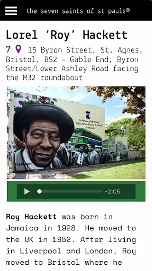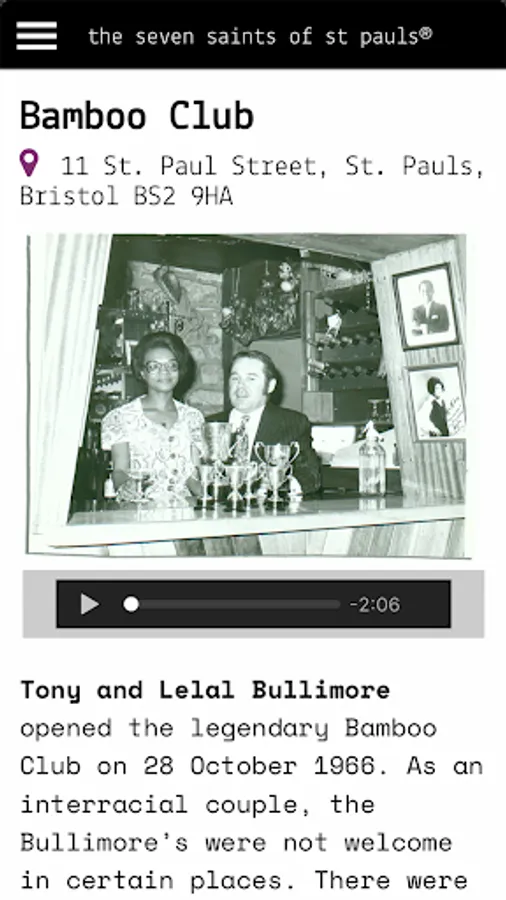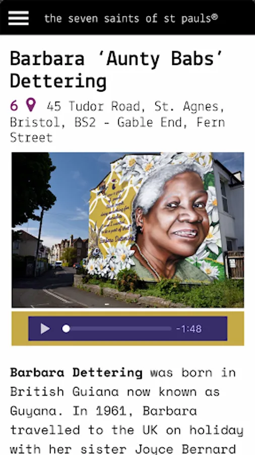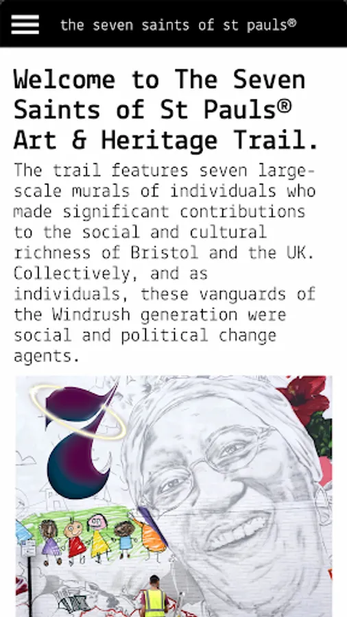 The app includes an interactive map showing all of the seven murals plus articles about The Bamboo Club, The Black & White Café, the St Pauls' Uprising, and The Bristol West Indian Parents & Friends' Association whose members established the St Pauls Carnival in 1968. With audio guides.