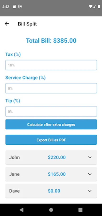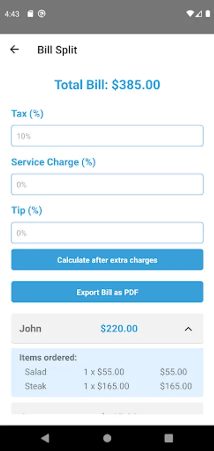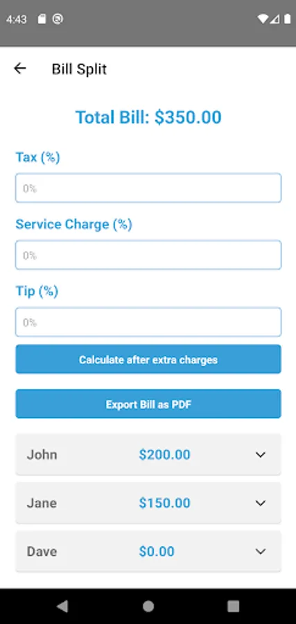 Split Your Bills is perfect for group meals, whether you're out with friends or family. It eliminates the awkwardness and confusion that often comes with splitting the bill, so you can enjoy your meal without any added stress. With the app's ability to split the bill with tax, service, and tip percentages included, take snapshots of the bills, and export the detailed breakdown, along with the images, into a PDF, you can rest easy knowing that everything has been taken care of.