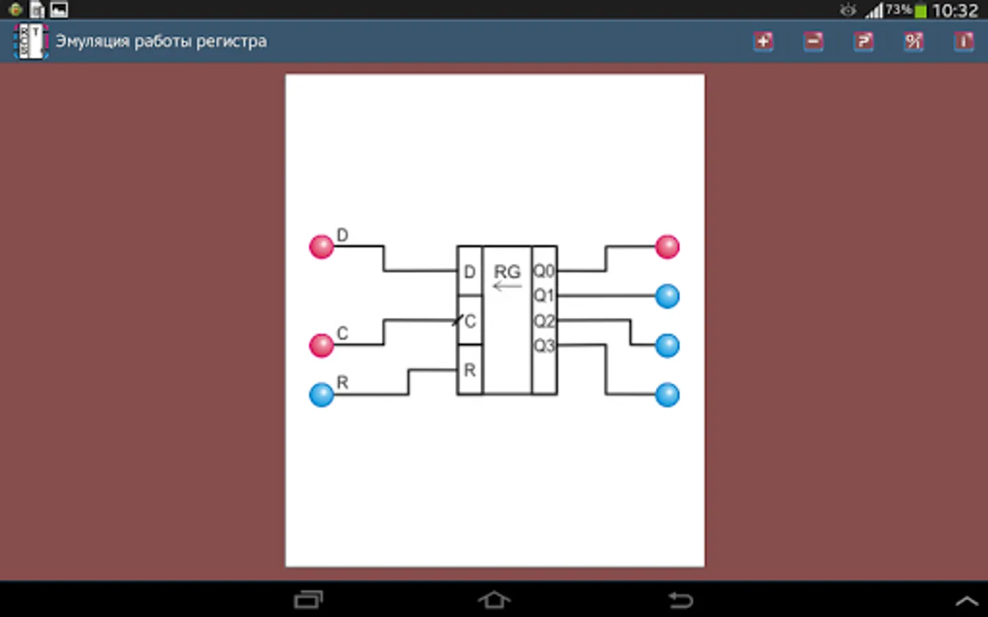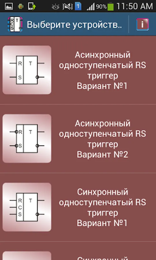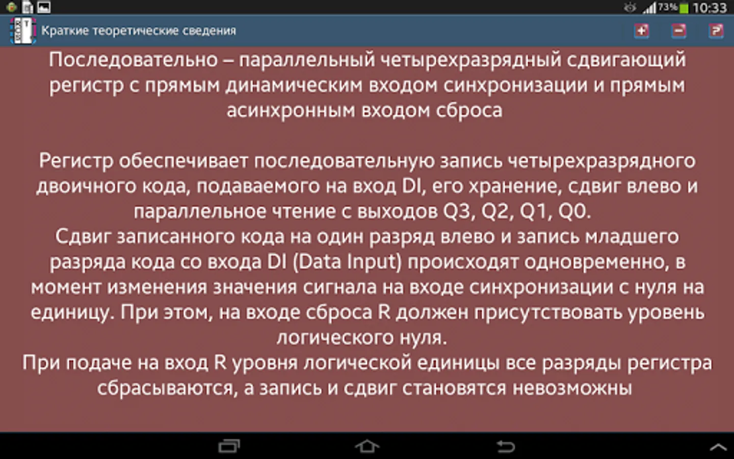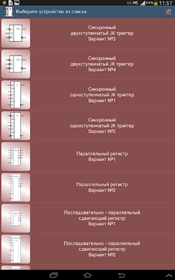 The app covers the main types of sequential devices. These include a variety of trigger elements, registers and counters of various modifications. A distinctive feature of all these devices is the availability of memory, which allows storage of the current state. This allows the use of such devices for short-term storage of individual bits of information small amounts of code words, the implementation of these simple changes, such as the shift to the right or to the left increments or decrements. A total of 42 devices are considered, most of which (30) make up the triggers. Among them, synchronous, asynchronous, single-stage and two-stage RS, D, T and JK flip-flops with direct and inverse inputs, with static and dynamic control. In addition, treated and parallel shift registers, summing, subtracting and reversible counters and frequency dividers.