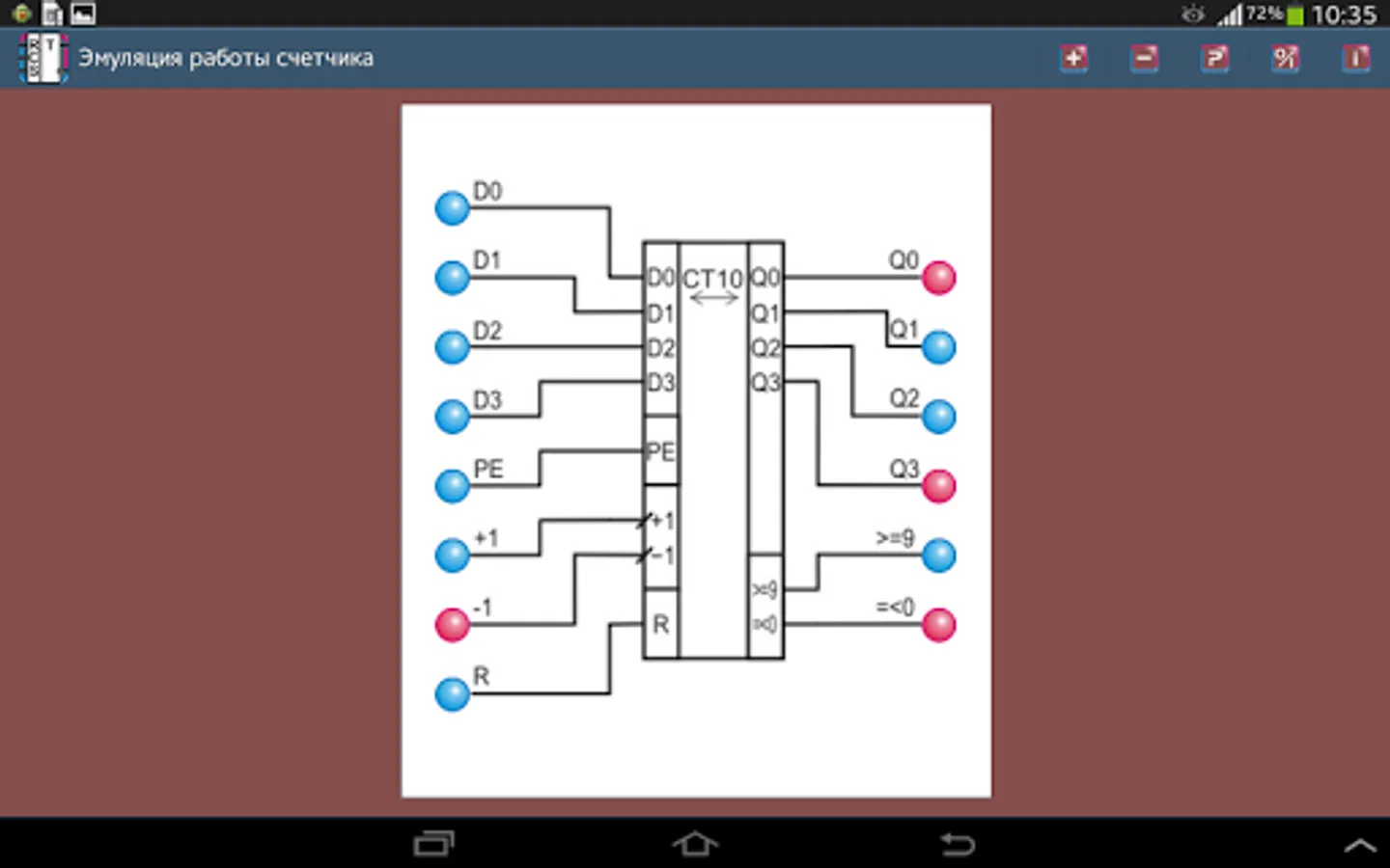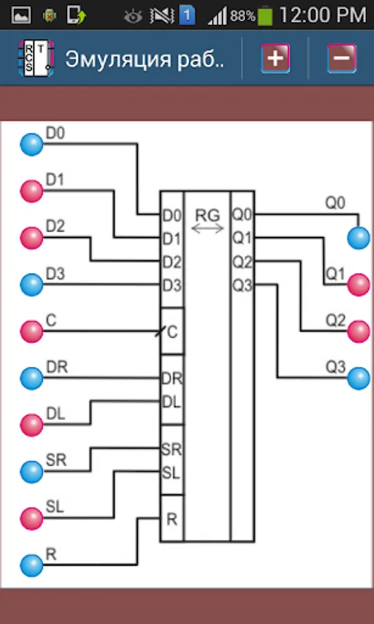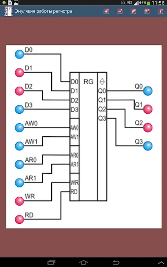 Touching any of the inputs of the device entails a change of input signal values to the opposite: a logic zero is replaced by a unit and vice versa. Displays the values of logical variables at the input and output device is performed color LEDs: blue color of the indicator corresponds to a logical 0, red - a logical 1, and gray - a high impedance state output.