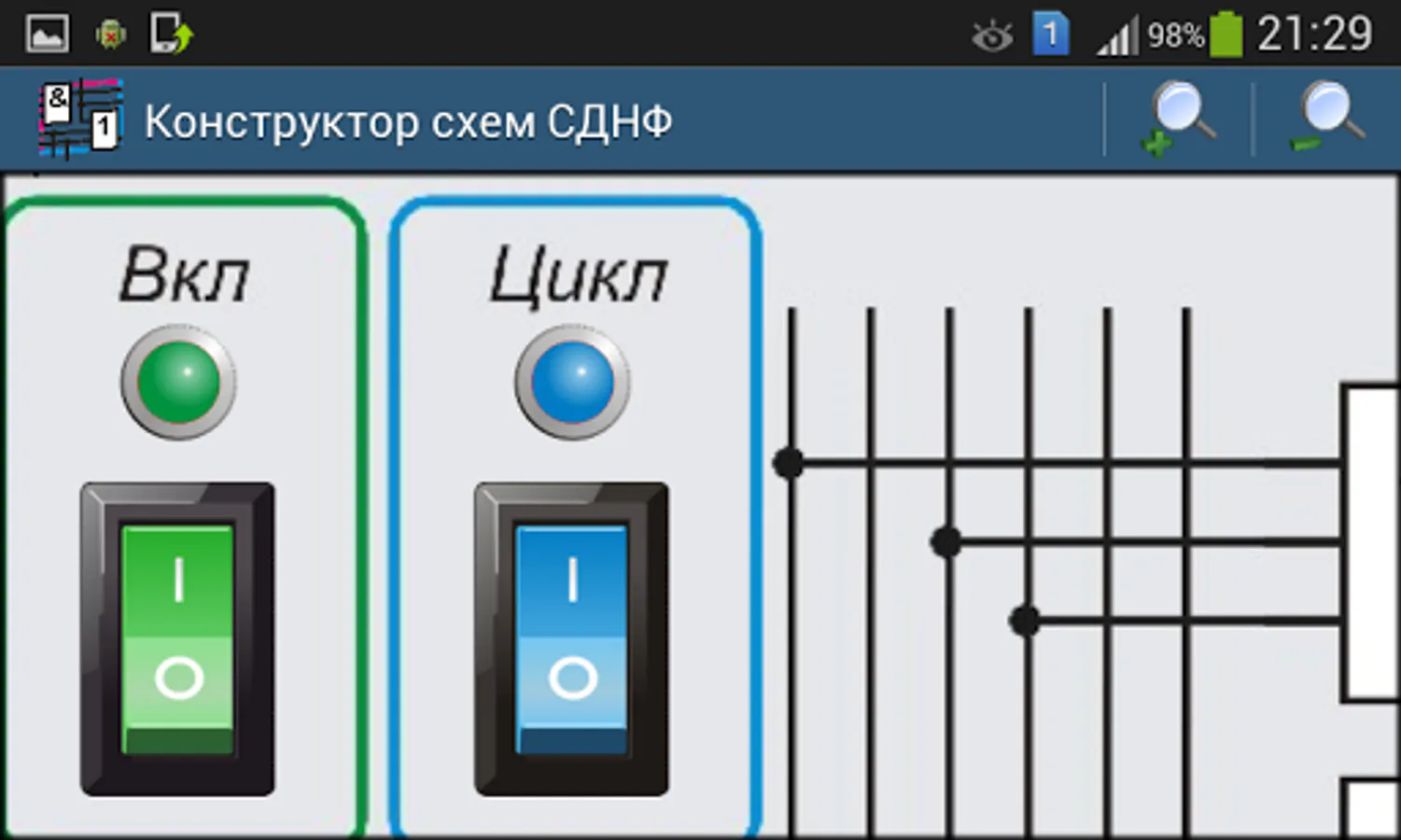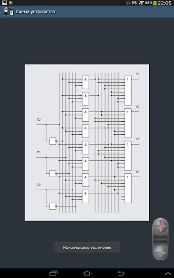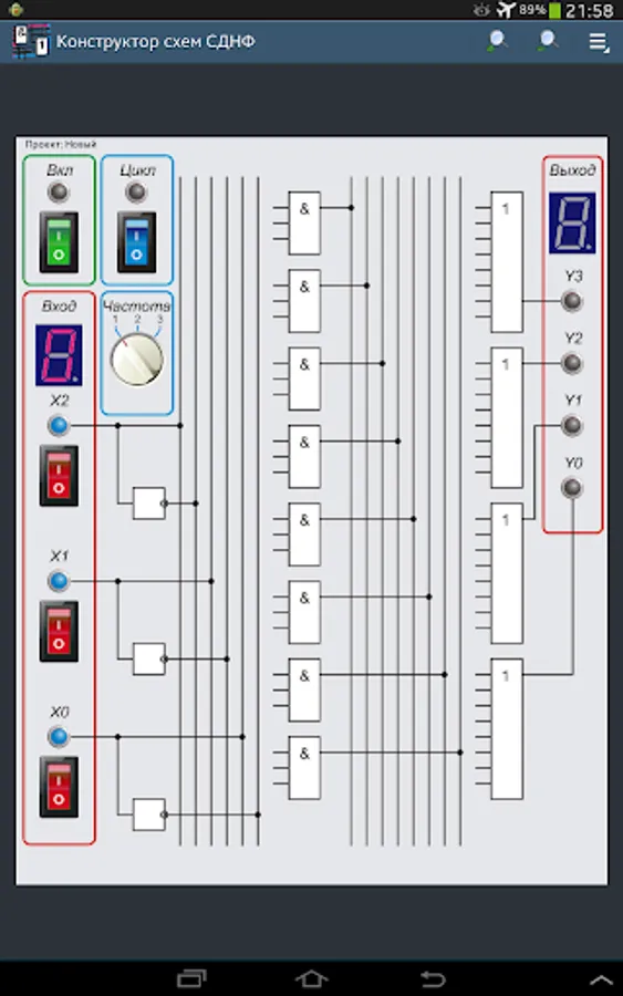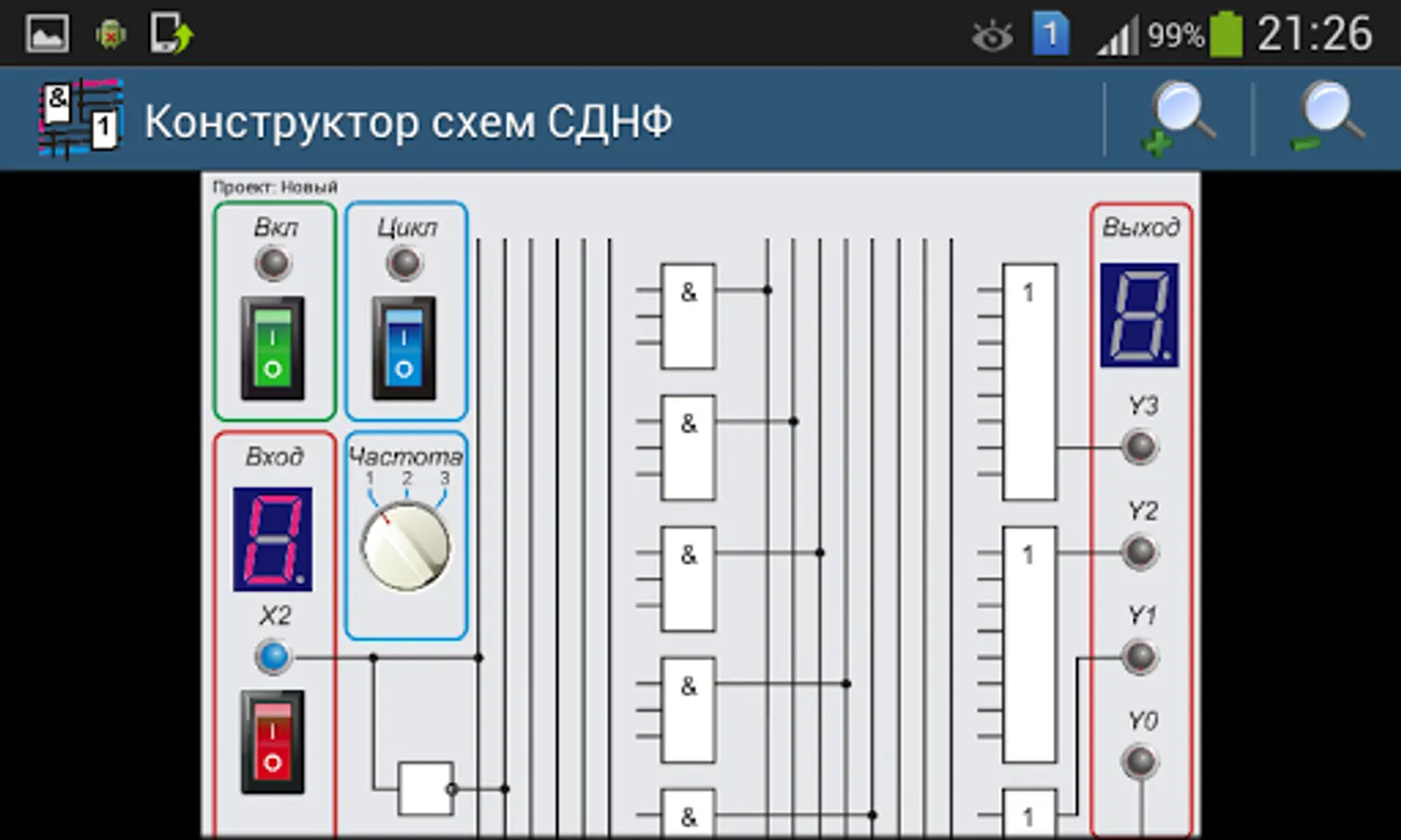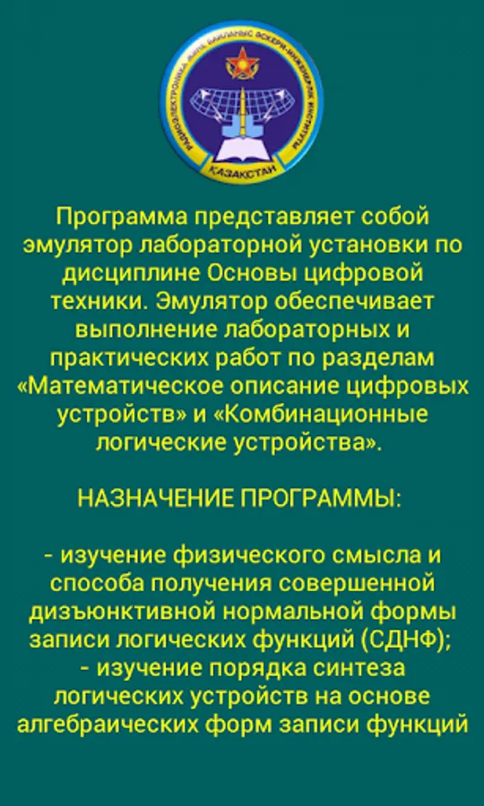 Learning applications, which is a simulator laboratory setup for the discipline Fundamentals of digital technology. The emulator provides performance of laboratory and practical works on the sections "The mathematical description of digital devices" and "combinational logic devices." The application can be useful to teachers of technical schools, students of the digital circuitry, as well as for those who want to self learn the basics of digital electronics.
