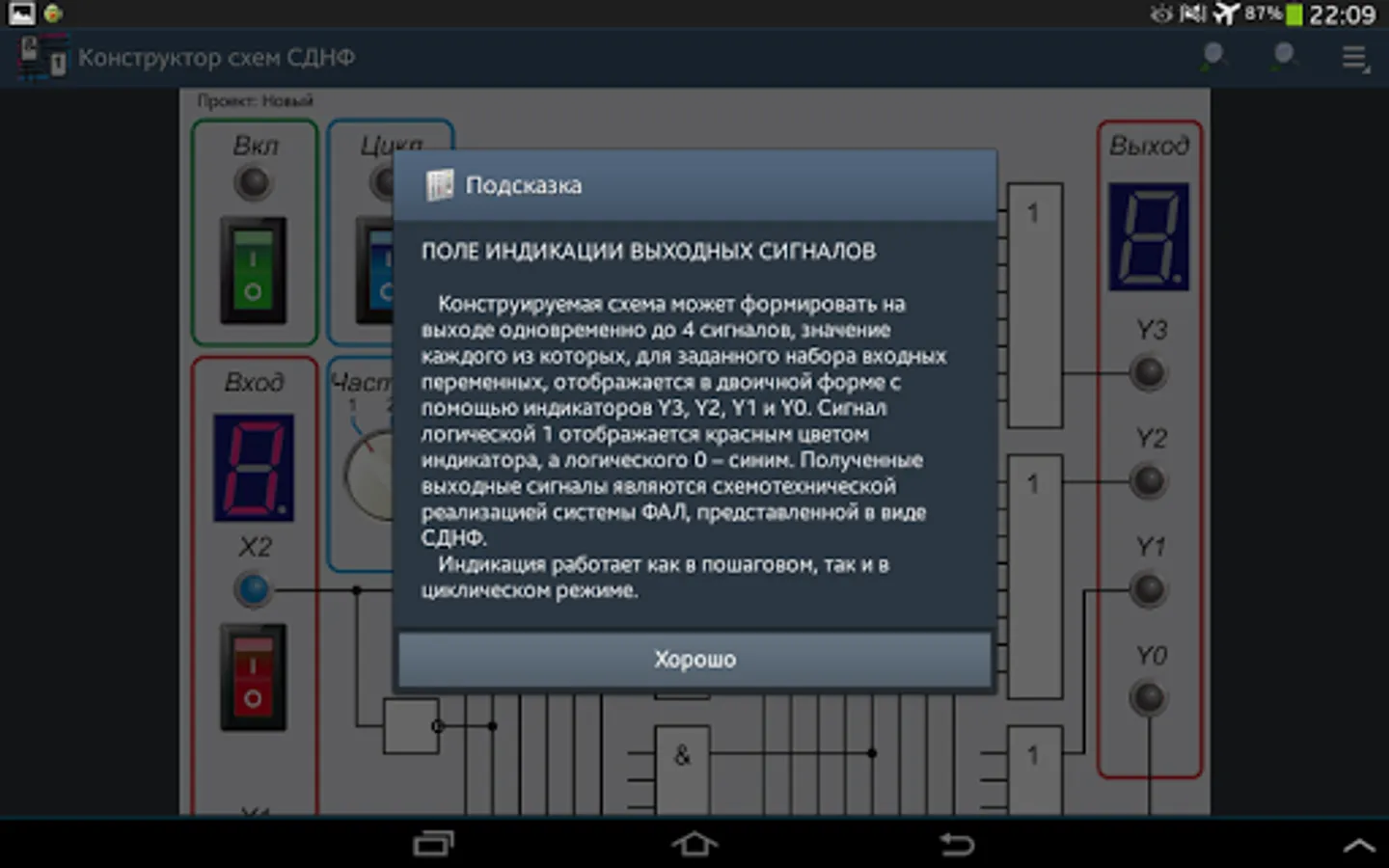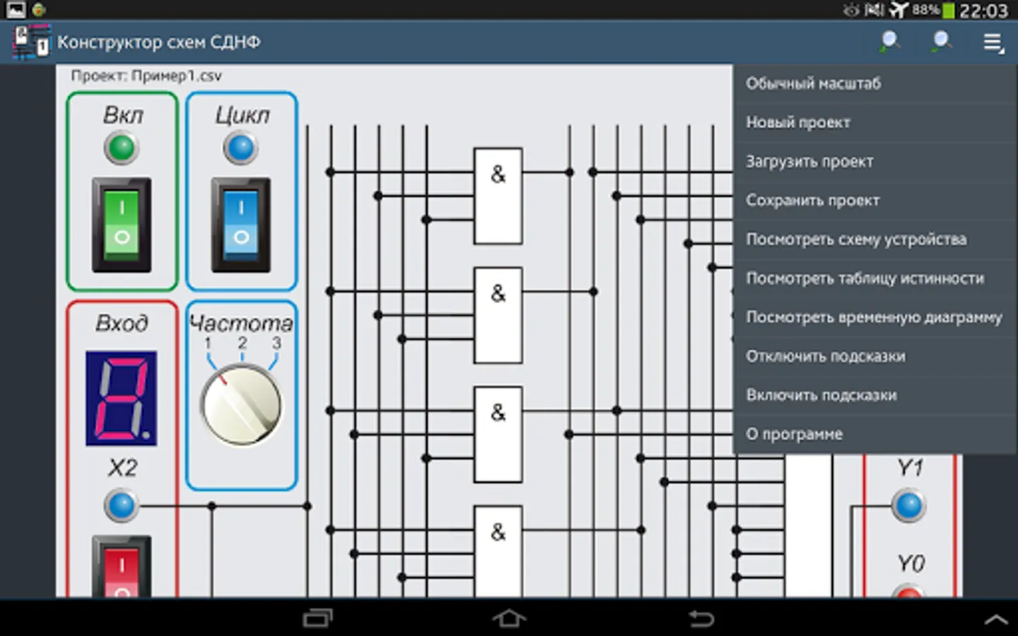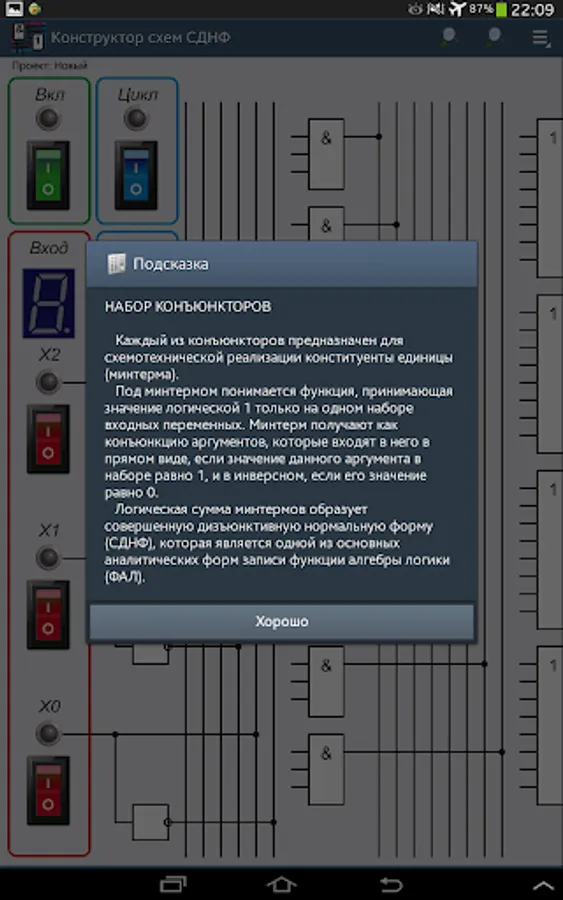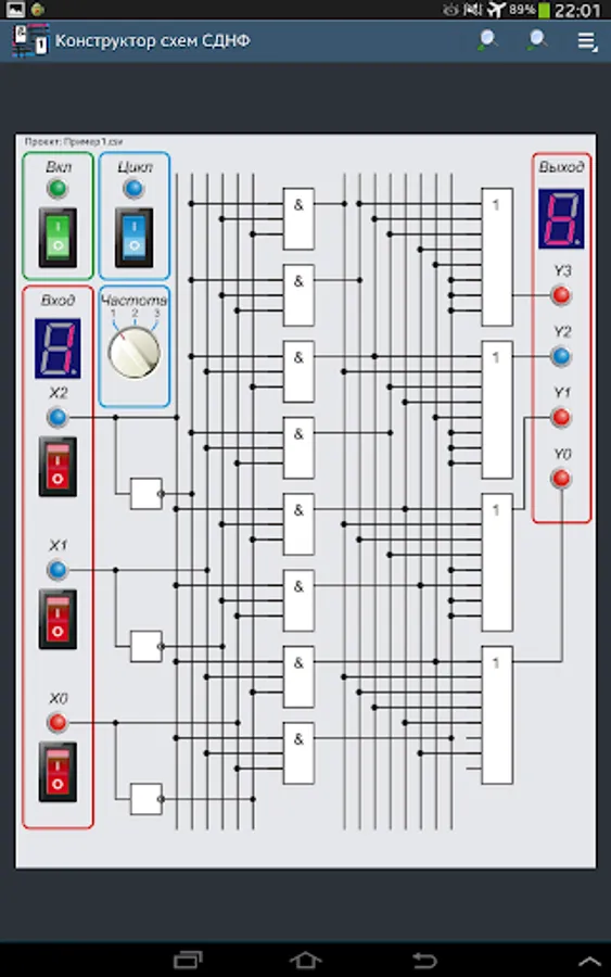The program allows you to design simple digital electronic circuits using basic gates: conjunctors, disjunctors and inverters. The circuit may include one, two, or three inputs. The maximum number of outputs - four. Thus, the emulator is able to realize up to four arbitrary FAL three arguments, providing, if necessary, a complete set of the constituent units (mintermov). To construct the device logic functions must be pre-formulated algebraically as PDNF.