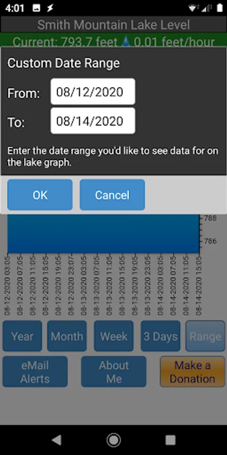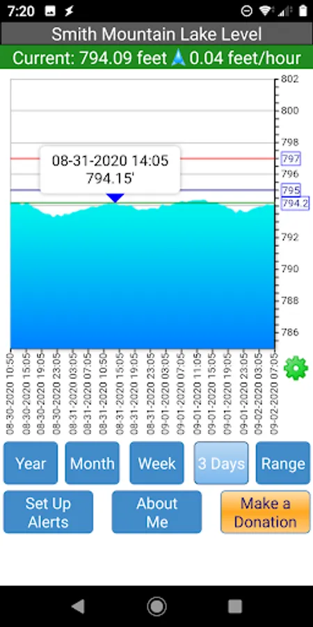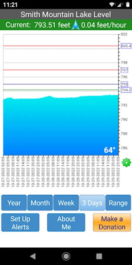 Smith Mountain Lake level graph, updated hourly. Also shows current level and trend (rise or fall rate), and now also water temperature!