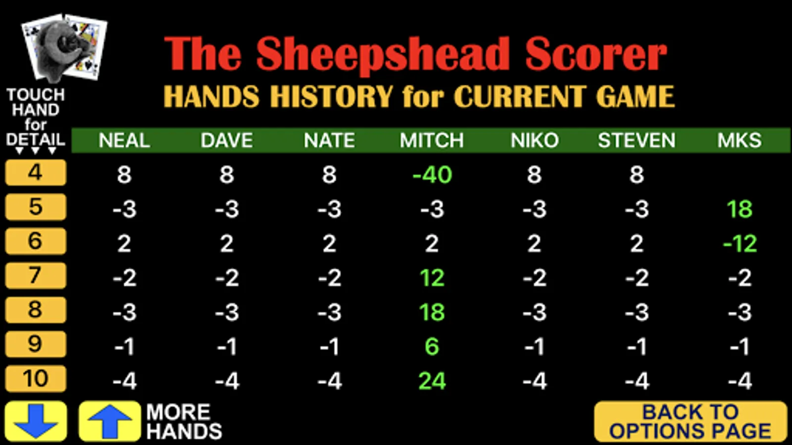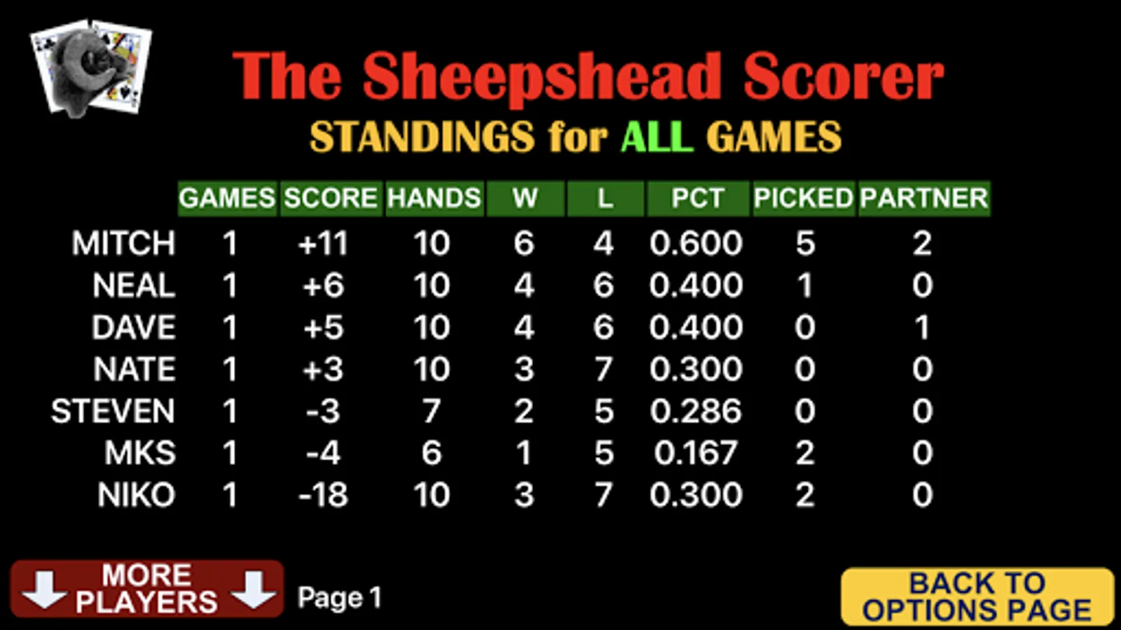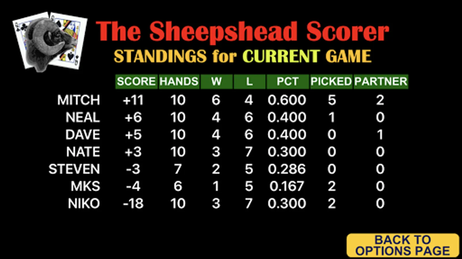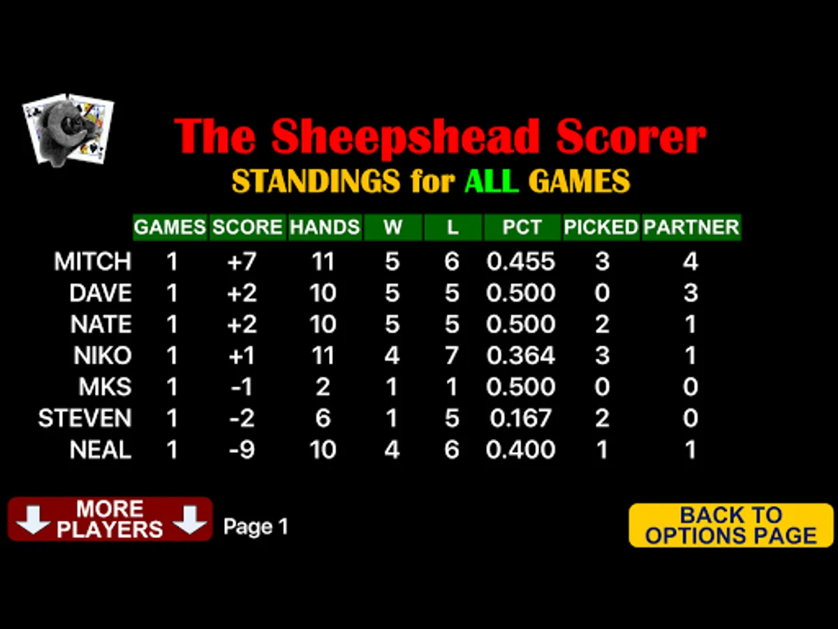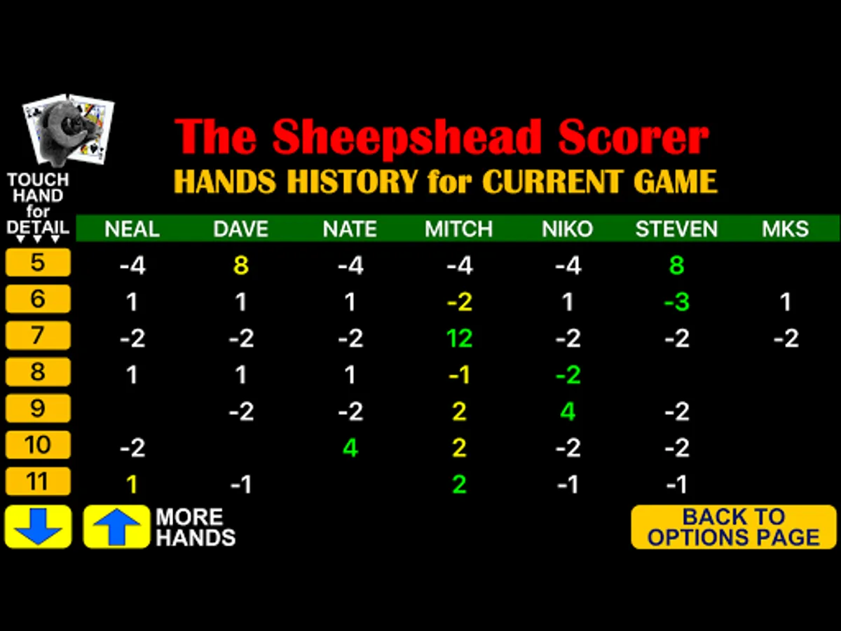 Additional features show player standings(scores, wins, losses, hands picked, hands partner) and history of the hands played for the game along with standings for all games played, not just the current game.