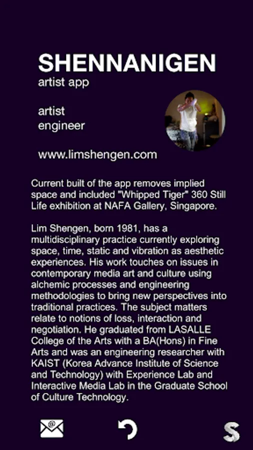 SHENNANIGENLab is an artist app by Lim Shengen. The app is meant to access different works or tests made by the artist to be made available for everyone. The app will constantly be updated with new content, using technology as a platform for the arts.