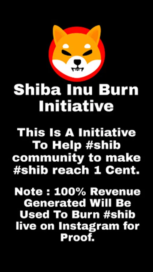 We have developed this app to burn shiba so that we can reach 1 cent, please note that 100% of revenue generated by this app will be used to burn shib live on Instagram channel, we request you shibarmy to come together so that we reach our common goal of reaching 1 cent as soon as possible so that we can be billionaires.