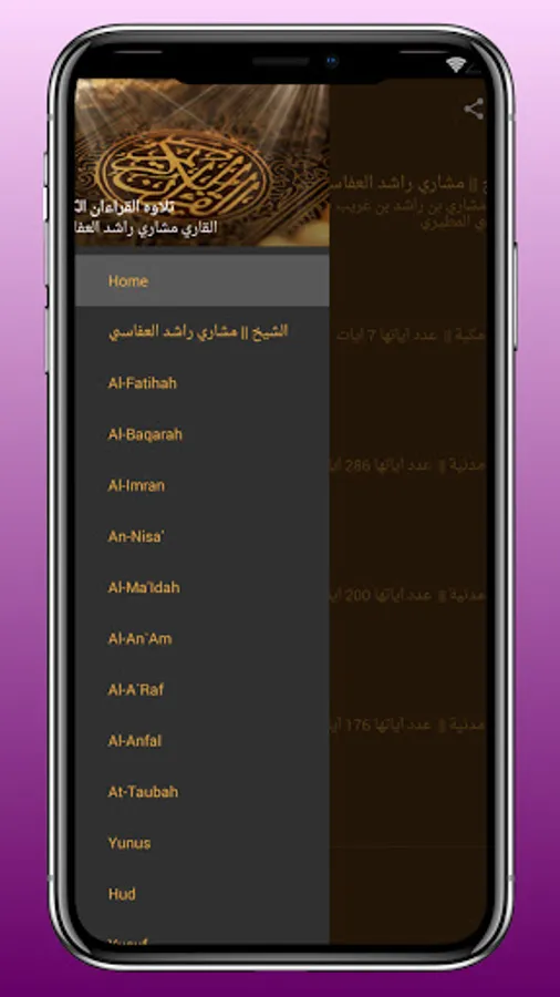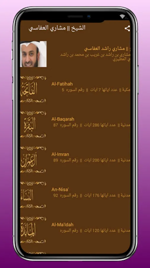 The Holy Quran application also shows you with the voice of Mashary Al-Afasy, the duration of each surah, the number of its verses, and where it was revealed until you are aware of this.