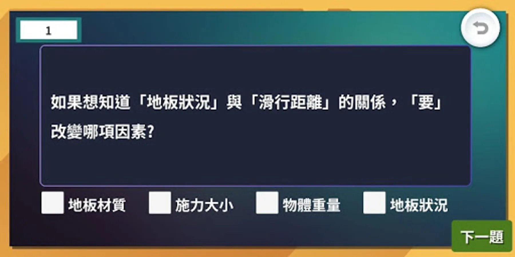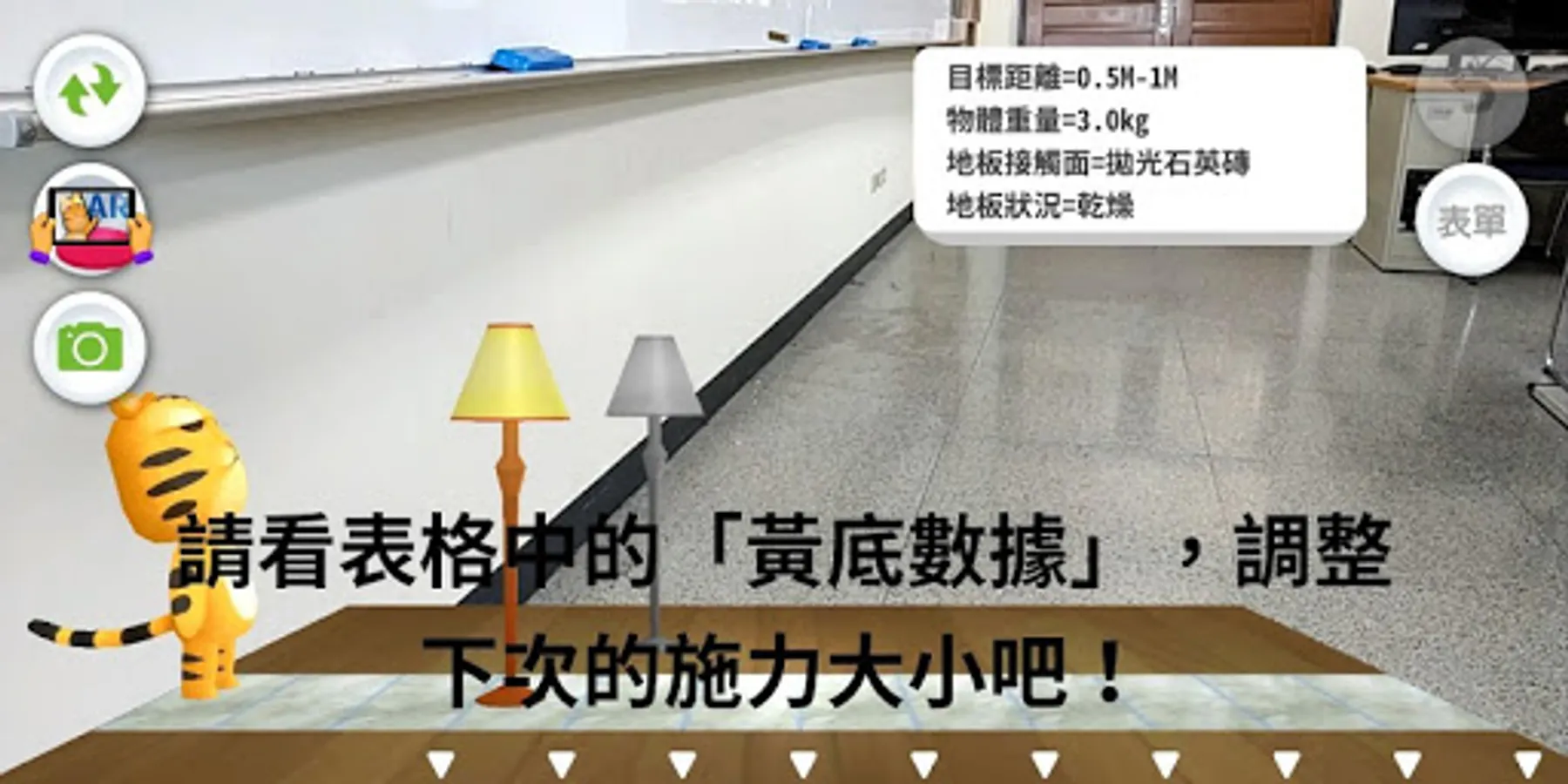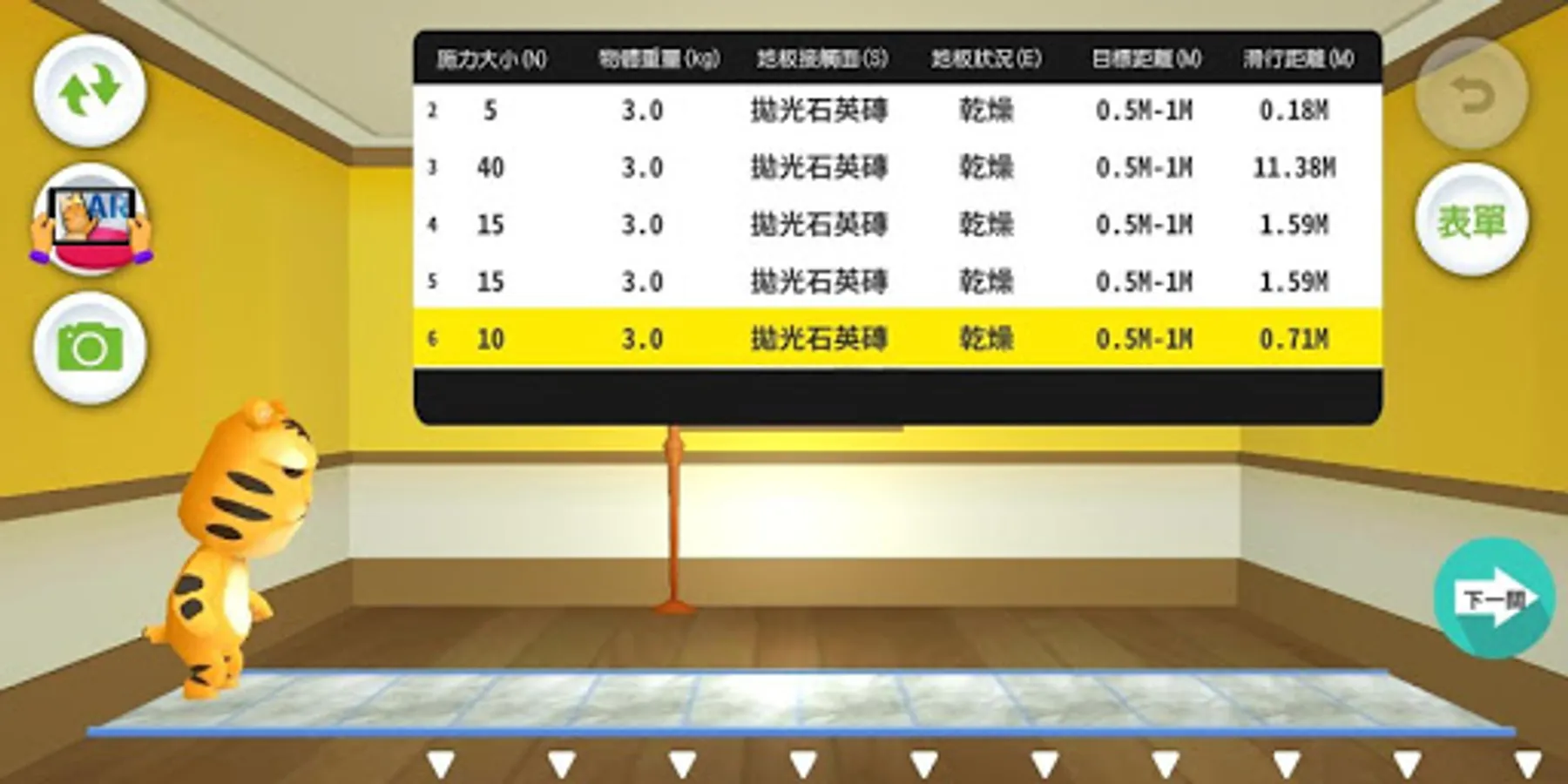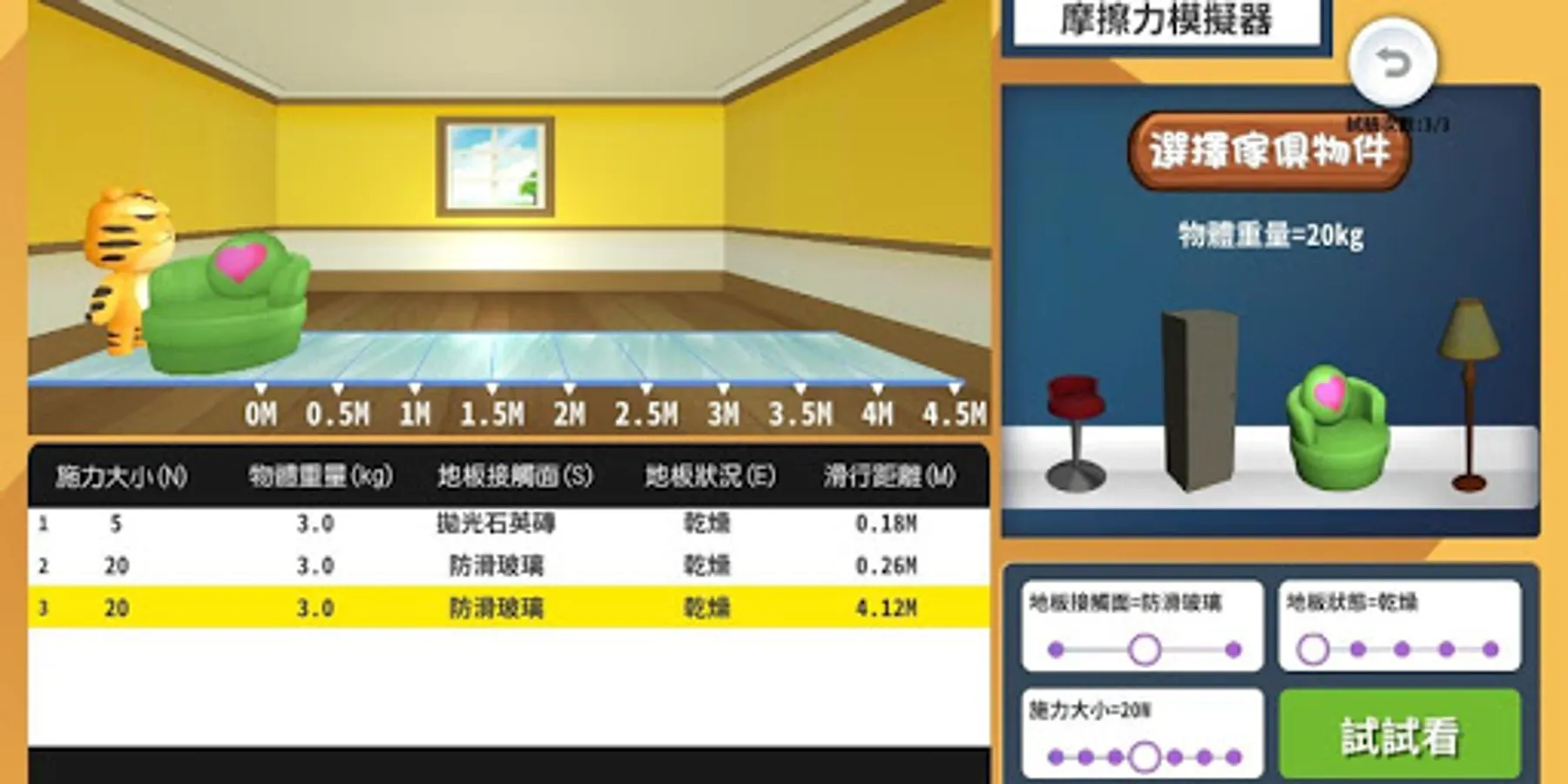 《摩擦力大挑戰》遊戲具備探究與評量的特色,遊戲具備三大關卡,包括:模擬挑戰、模擬器操作、能力檢核。系統內提供不同的變因參數讓使用者進行實驗探究,藉此培養問題解決的能力。此外,若能搭配本研究團隊開發的AR圖卡和探究實作教材包進行實驗操作,或許能讓您有另一番新體驗。