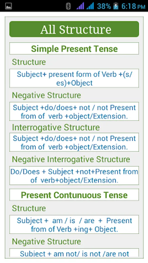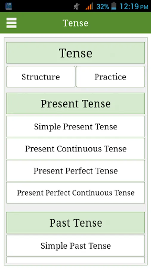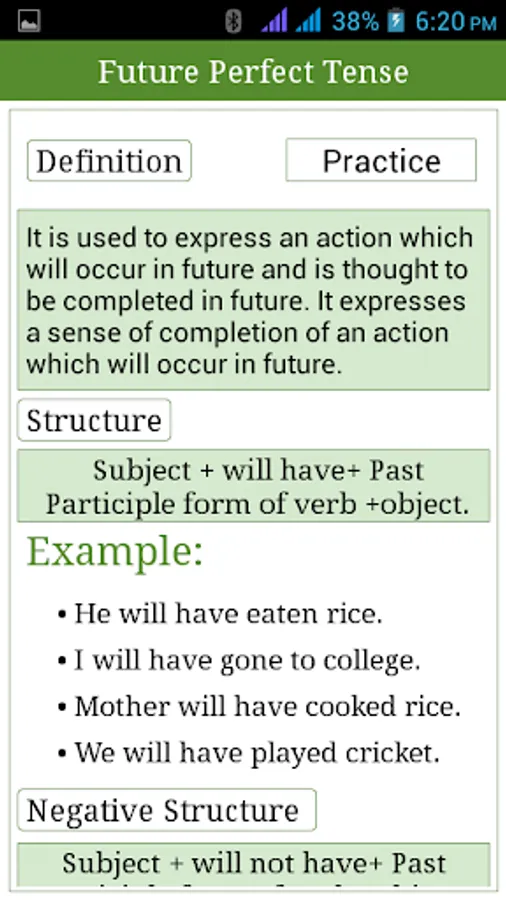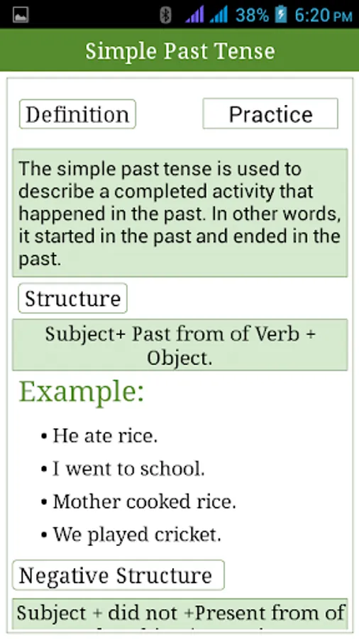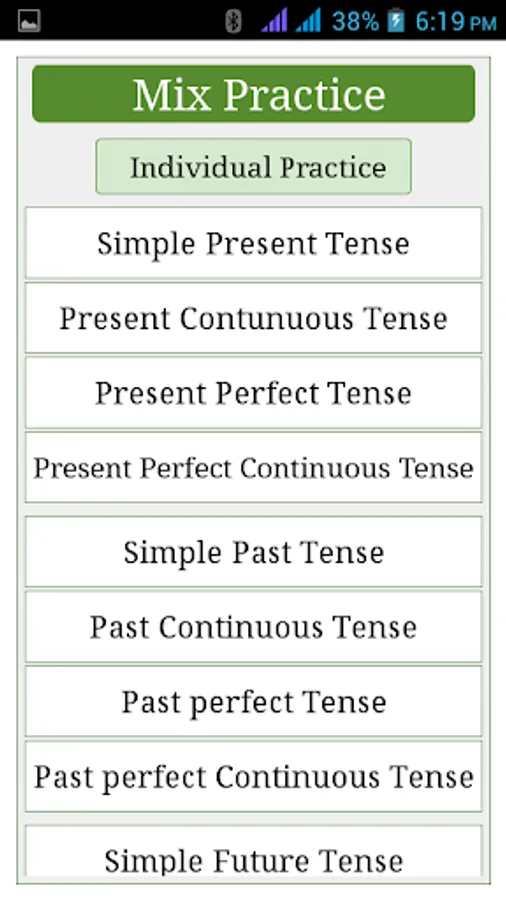 You also get Structure of all Tenses, Example of all Tenses and More than 300 Practices ( Mix practice and Individual practice ). Tenses in any language are the basic topics in both writing and communication of that language. We cover in this app.