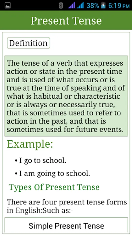 This app helps you to learn the English Tenses very easy and proper way. You can increase knowledge of Tenses in the English Language. You can study tenses by using different sentences like (Positive use of Tense, Negative use of Tense, Interrogative use of Tense, Negative Interrogative use of Tense. This app helps you how to use auxiliary verb.
