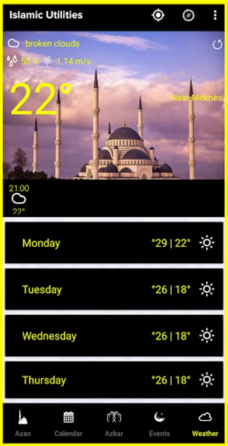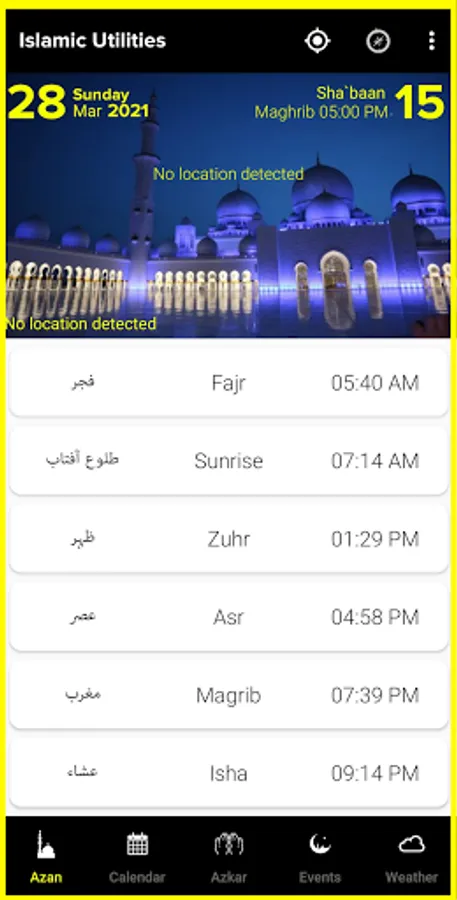 Salaat First can give you prayer times and weather in your location also with some features like Qibla direction that can help you to find the direction of Qibla everywhere you are on the world, with some Azkar after and before Salaat, that can help you too to know the time of Salaat on some events of the year and a good view with the calendar.