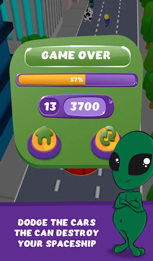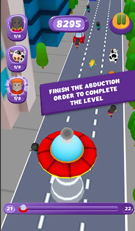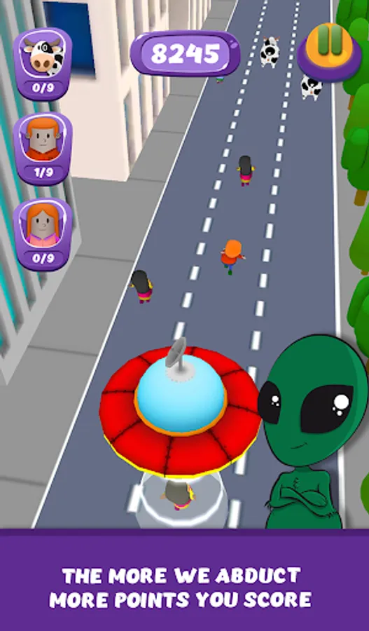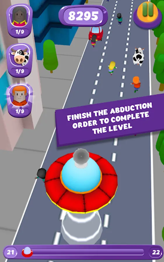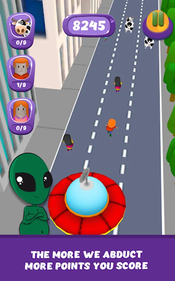 Your duty is to abduct all the living beings requested by the mothership with your spaceship, but be aware to not abduct cars, as they can damage your ship.