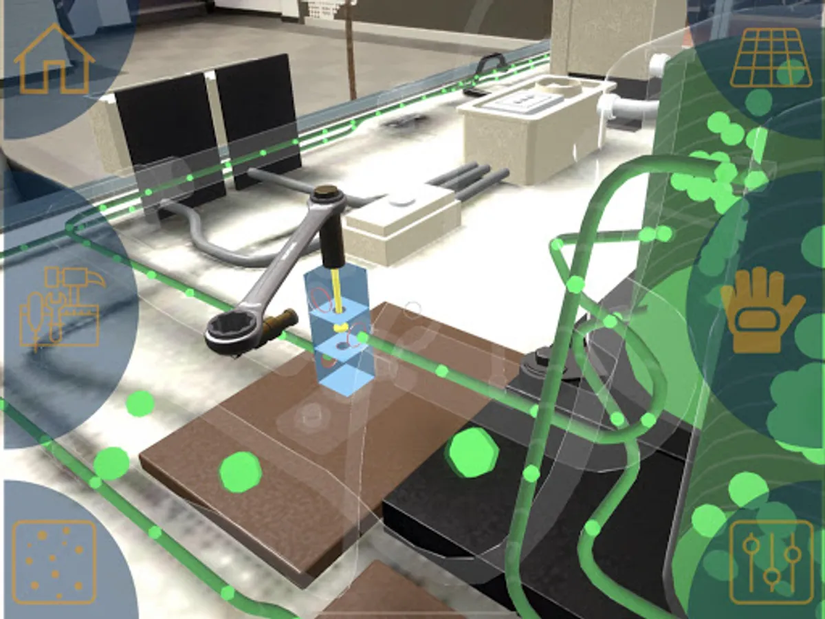 The AR app boasts an extensive step-by-step guide of all processes with a high level of detail. Apprentices are even asked to select the virtual tools and protective personal equipment required for the process before beginning.