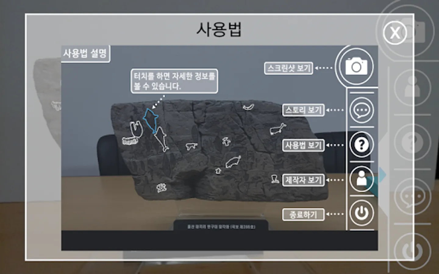 It is an augmented reality (AR) application for customers who have developed and developed a 1/40-scale model sold by Bandu Gallery Co., Ltd. Based on the semi-miniature miniature that is produced and sold offline, you can experience various patterns drawn in the monumental petroglyphs and the hidden story of the petroglyphs.