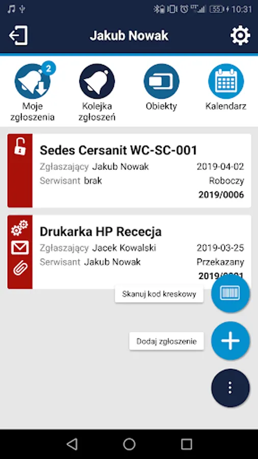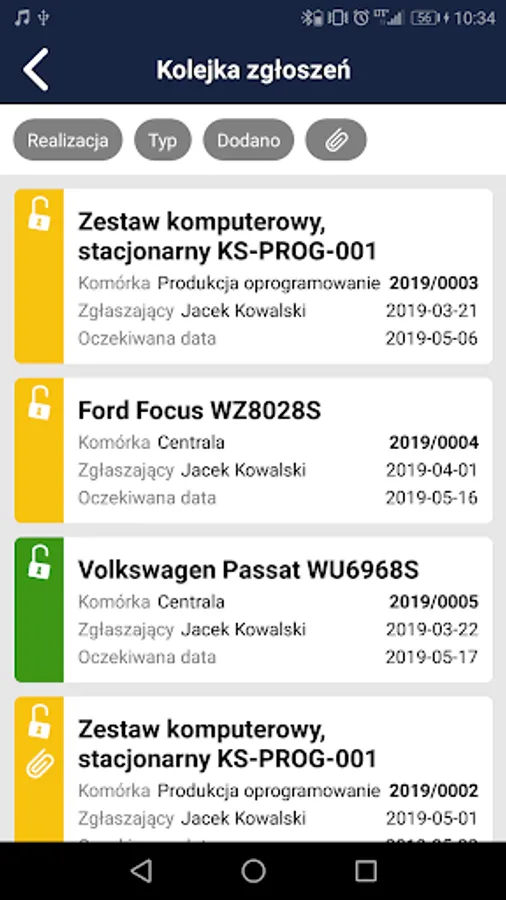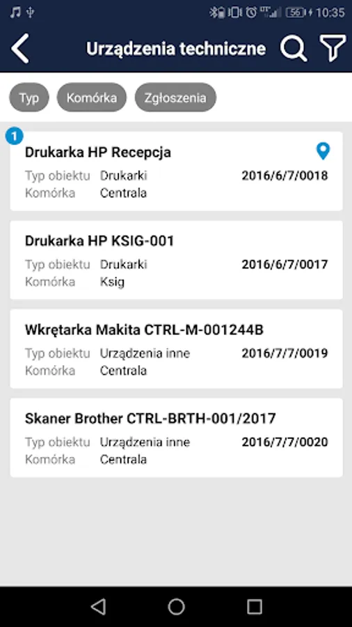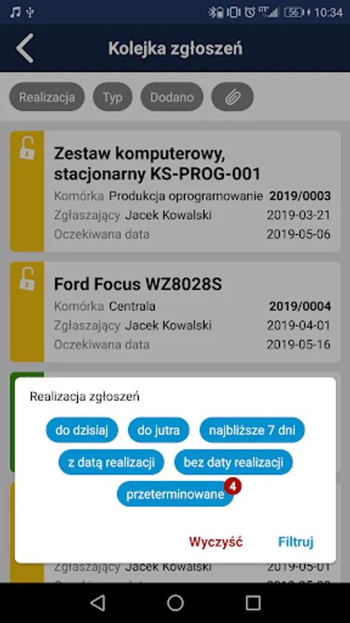 • access to the list of current reports assigned to the service technician (stored in the ERP system database) with the possibility of filtering by type (failures, damage, inspections), status (eg open, paused, rejected, closed).