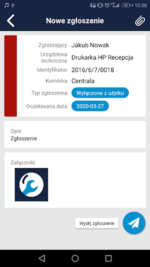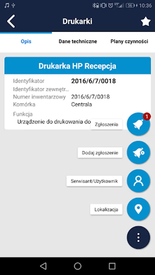 • possibility of entering a new application (notification list), by selecting the type, entering notes, determining the device by scanning the code from the label on the device using a camera with a flash