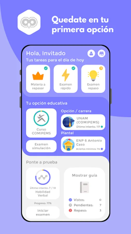 Sí Me Quedo is an exam simulator and guide for entering the Upper Middle and Higher level that allows you to practice as many times as you need to secure a place in the school of your dreams.