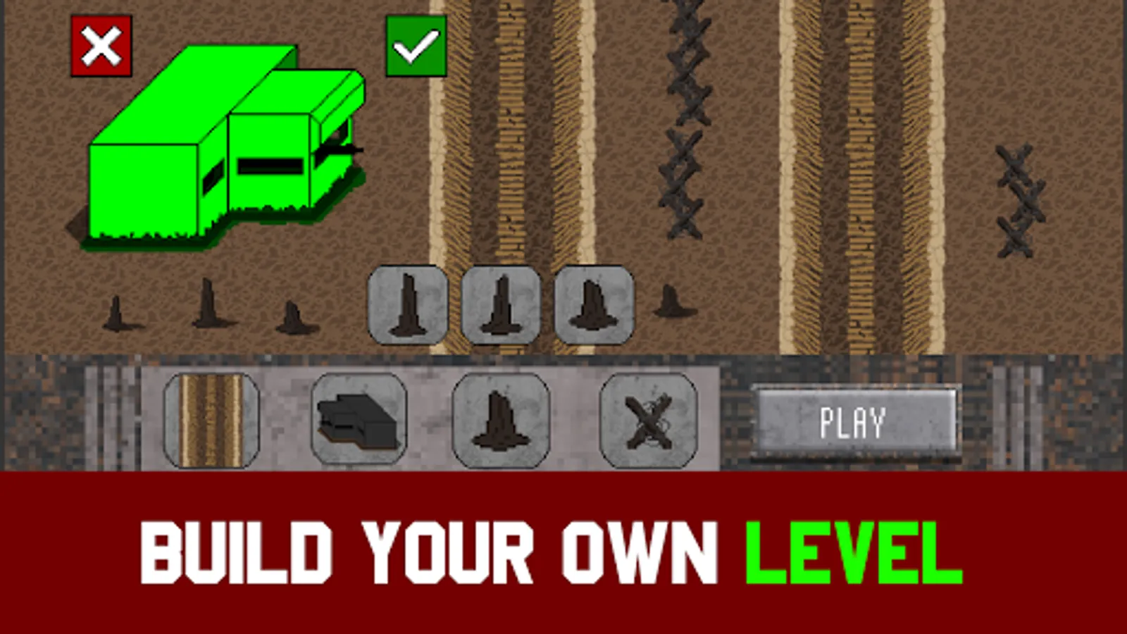 Build your battleground in the creative/sandbox mode according to your own strategy. Place decorations, armor bunkers / army buildings, barbed wire and tanks to sitotamulate a total war against the enemy army!