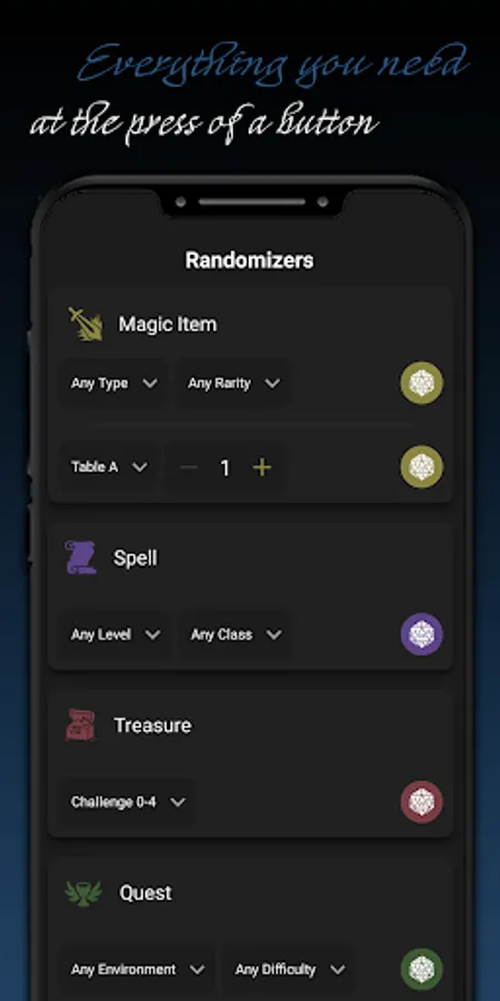Ever award your players a spell scroll and don't know what spell to make it? Need an interesting idea for a side quest before your party continues the main quest? Have no idea what your BBEG is going to drop once your players defeat them? Let D&D Genesis: DM Companion handle that for you.