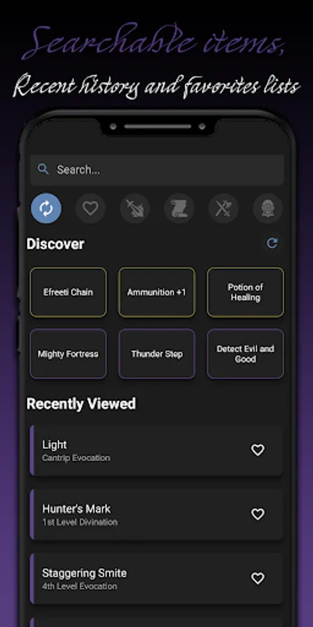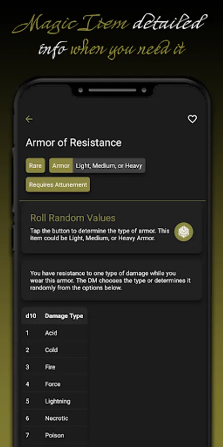 DM Companion is designed to make things quickly and easily accessible. DMs can randomly generate all kinds of useful things and lookup item. Don't waste time during a session looking things up in books or fumbling through multiple pages of an app or website. Recently viewed items can be found in a list to see what was last viewed, and all viewed items have the opportunity to be added to favorites in custom lists!