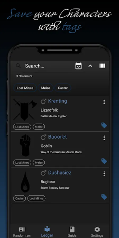 D&D Genesis also supports saving characters and tagging them for easier sorting. Keep a collection of past characters you enjoyed or future characters that you look forward to playing. Share characters with your friends, or send a character to your DM to let them know what gallant warrior or mystifying mage you’ll play next!