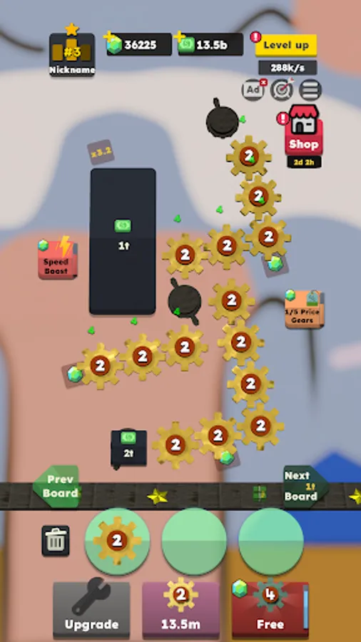 In Idle Gears, you can create your own gear factory from scratch. Buy gears of different shapes and colors and place them on the board. Watch them spin and click together, creating a symphony of sounds and visuals. Merge gears of the same type to level them up and earn more money. Unlock new boards and discover new types of gears. Earn AFK rewards even when you are not playing.