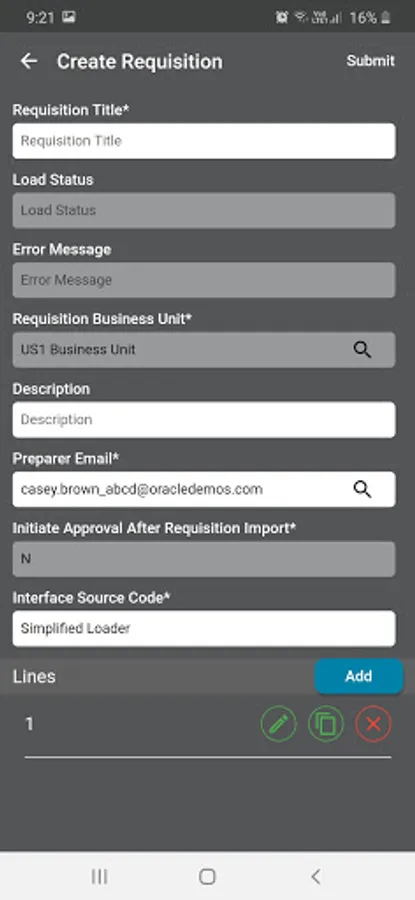 Simplified Loader Requisitioning App enables creating Requisitions from the mobile device. The app offers centralized control to the administrator to define mandatory fields, default values, and dynamic (SQL based) default values. Multi-level data defaulting logic makes it practical for the user to input as fewer field values as possible to complete the Requisition input. The associated lookup values assist in avoiding any data input errors.