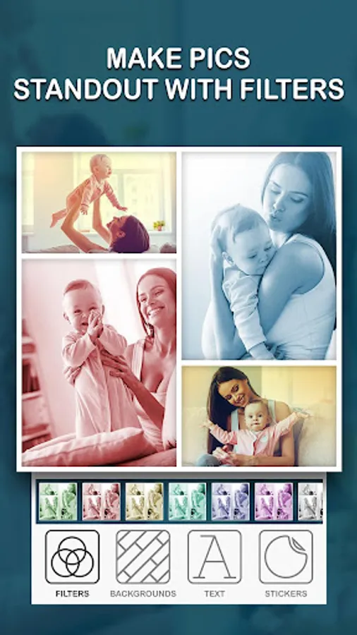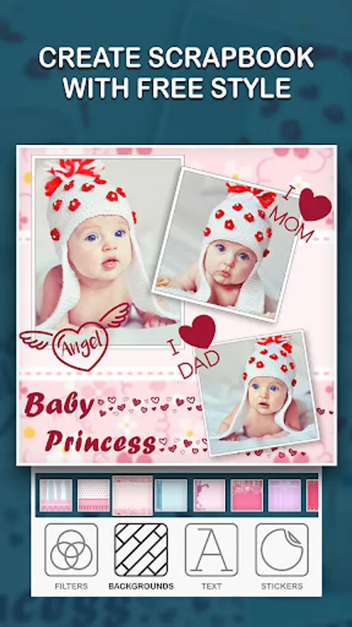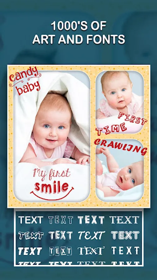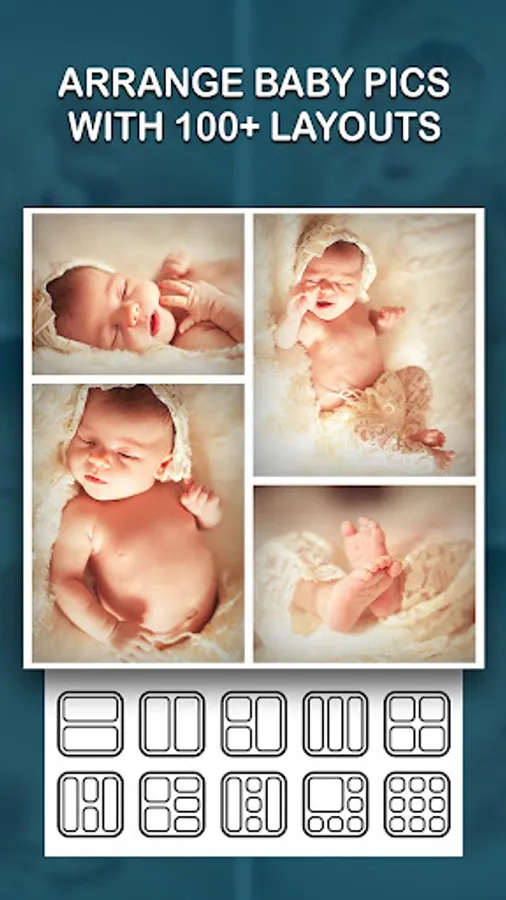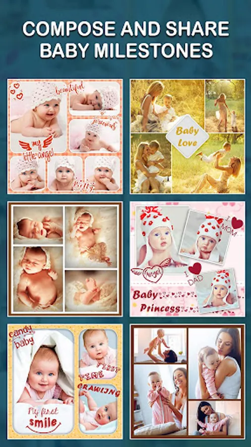 Baby Photo Collage Maker is a powerful collage photo editor for you to create amazing Baby Photo Collages using your photos, fun stickers, backgrounds, text with layout and texture.