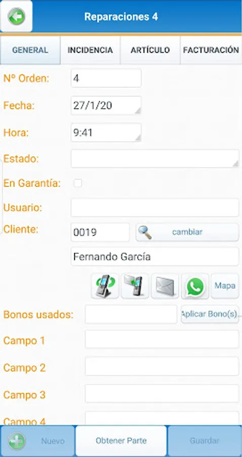 • Quick access to call, send SMS or e-Mail Customer associated with a part / service.