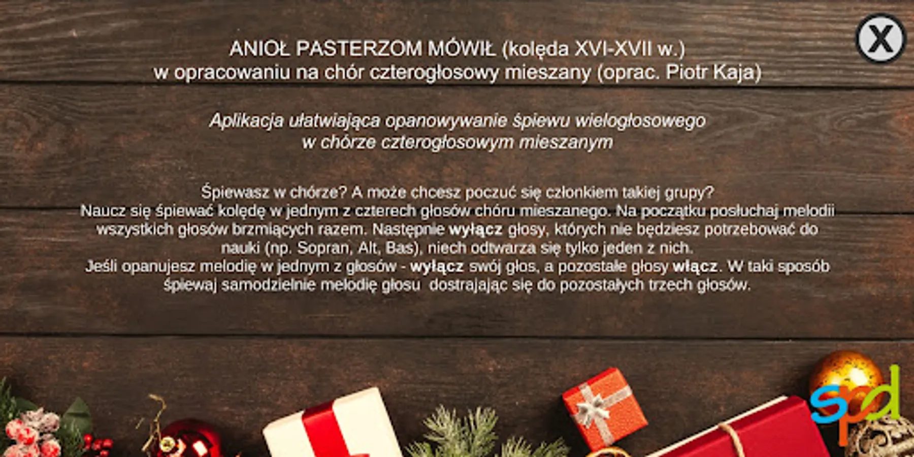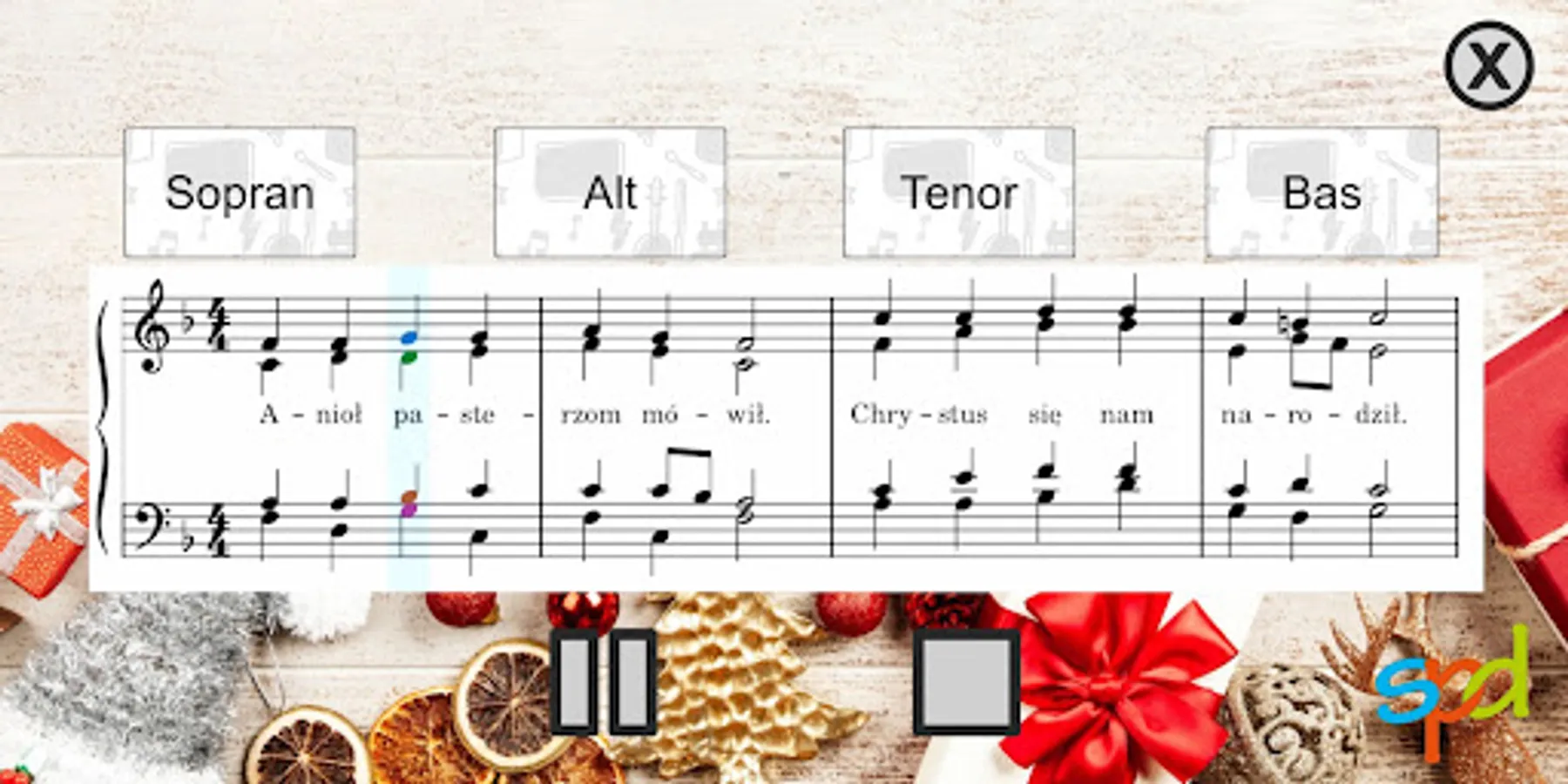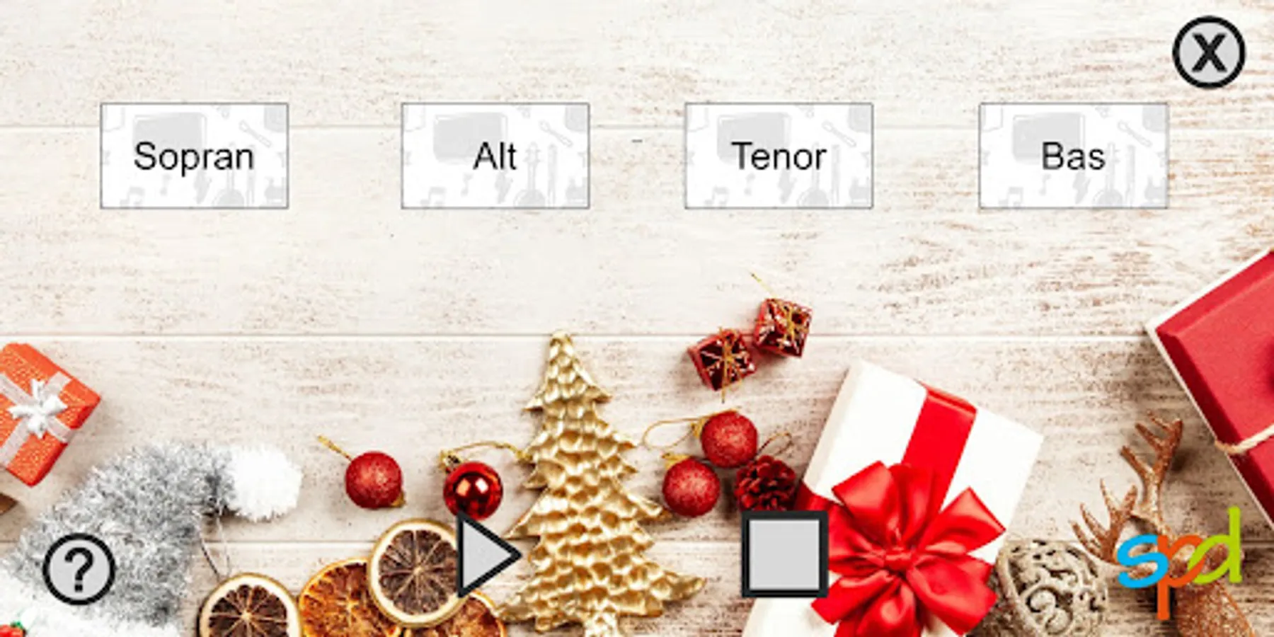 Learn to sing a carol in one of the four voices of a mixed choir. First, listen to the melody of all the voices sounding together. Then turn off the voices you won't need to learn (e.g. soprano, alto, bass), let it play only (e.g. tenor).