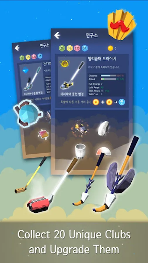 Each Gwarp clubs have distinctive skills. Those skills can be useful when hitting the golf balls and fighting with monsters. In the laboratory on the menu, you can upgrade your clubs by installing special attachments. Some rare attachments can change the outfit of the clubs and even their skills.
