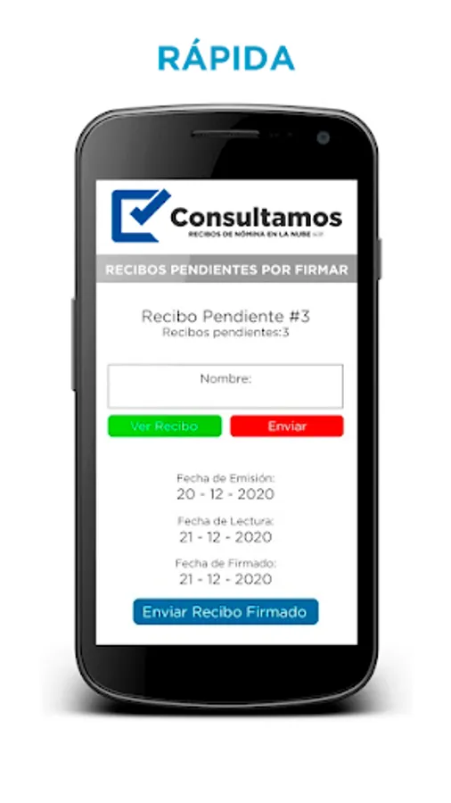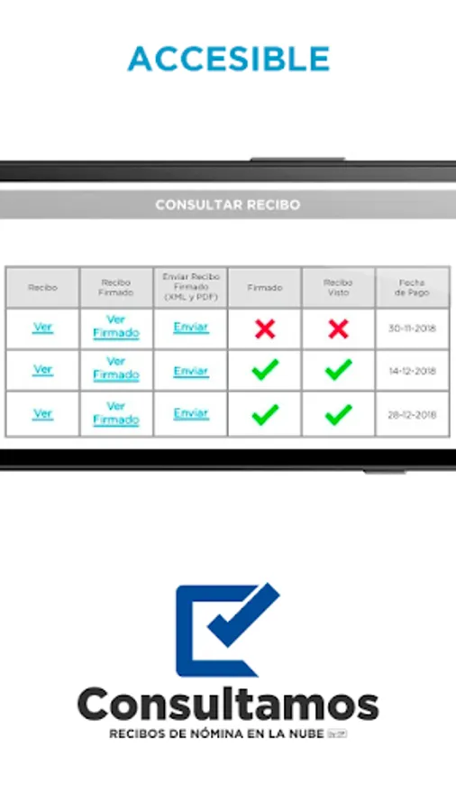 The application of Consultamos.com.mx is a safe, innovative and environmentally friendly alternative for your employees to consult, accept, sign and download their payroll receipts from their mobile device.