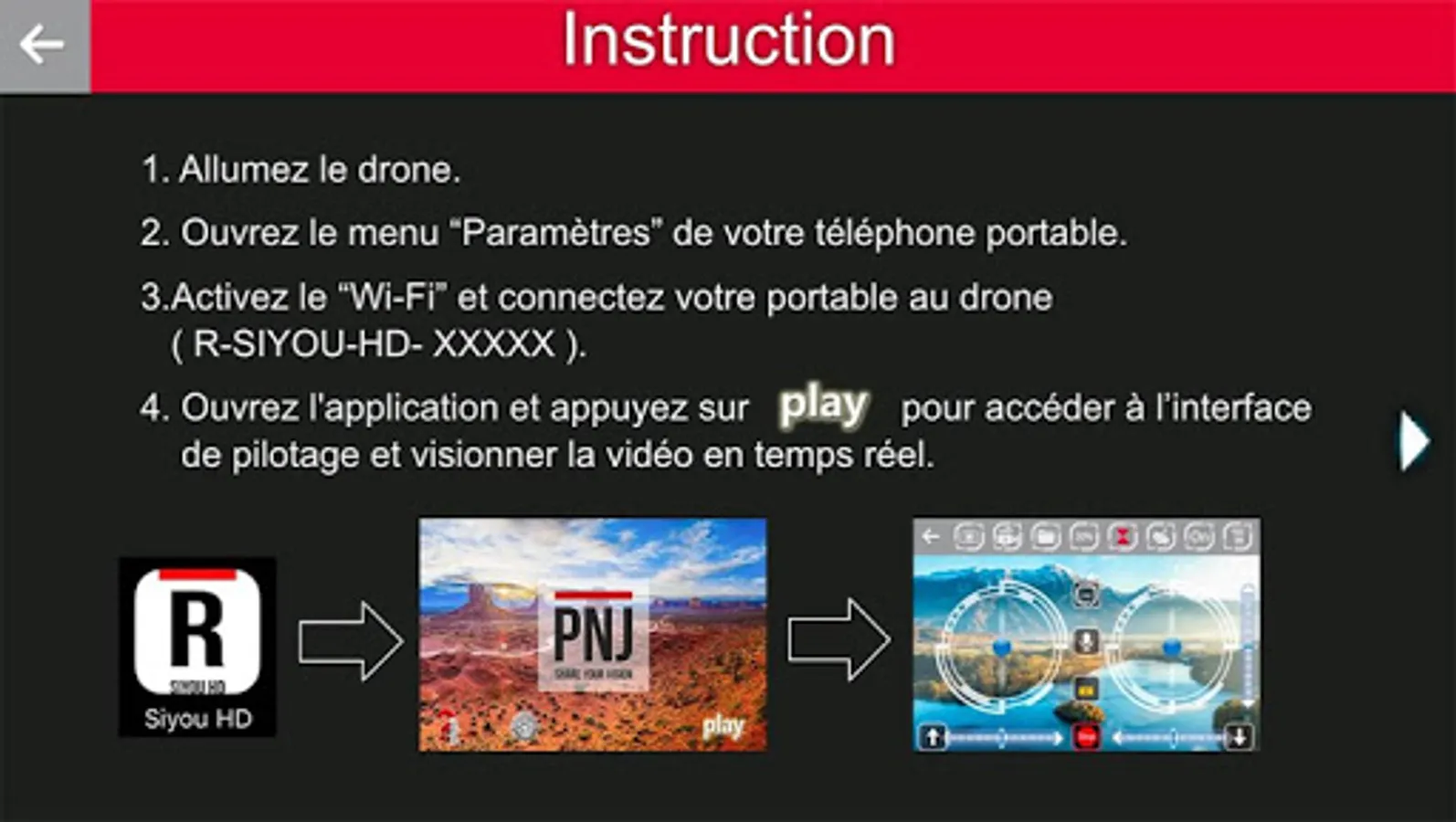 Download this application for free to pilot your PNJ R-Siyou HD drone using your smartphone or tablet, easily film all your adventures and take advantage of all the drone's features.