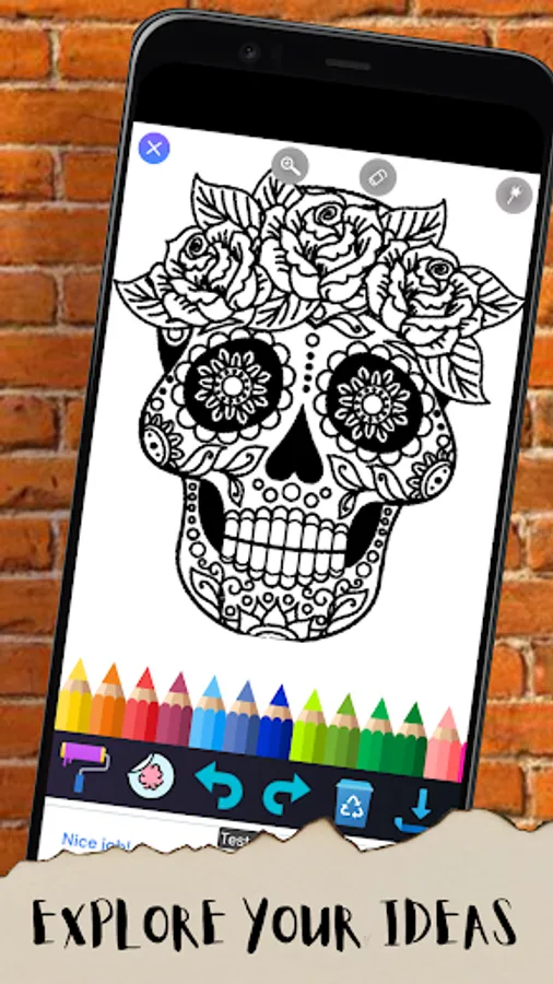 Our recolor games adults is easy to use. All you need to do is just choose one of your favorite sugar skull pictures in this Skull Glitter Coloring Book, pick the color you want, and then tap to the pictures to fill the color. If you want to change the color, you can use the undo and redo buttons. In addition, you can also zoom in and zoom out the sugar skull coloring pictures to color every detail. Once you are done, save and share your sugar skull coloring works to impress your friends.