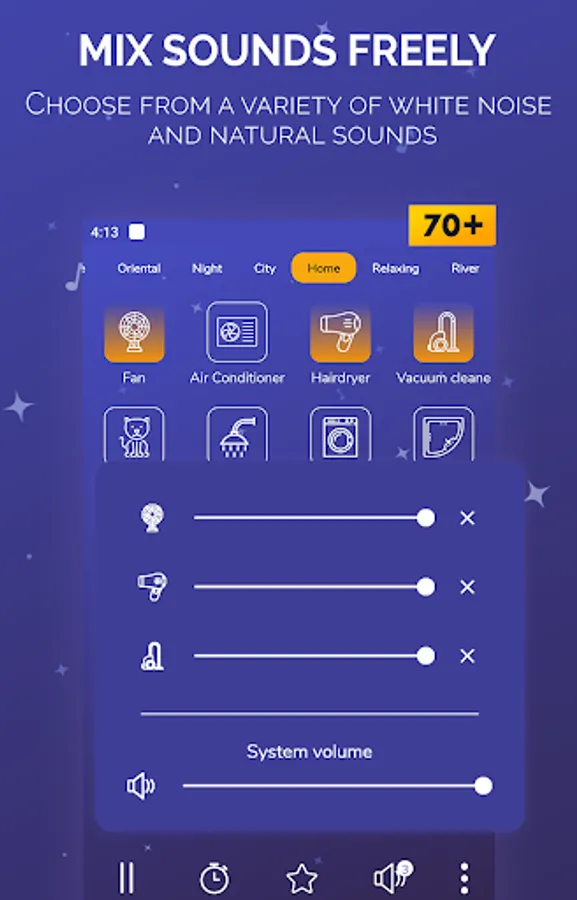 With Sleep Sounds app, you have complete control over your sleep environment. Customize your experience by combining different sounds and music to create the perfect blend for your personal sleep needs. Adjust the volume and mix the sounds to your preference, creating a unique and tailored ambiance that will help you doze off effortlessly.