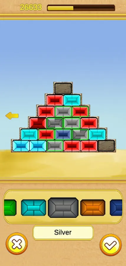 As the pyramid grows, the following blocks will be available to you: sapphire, ruby, emerald, aquamarine, silver, gold, onyx, pearly and amethyst.Throw blocks will be strong and weak Egyptian builders.