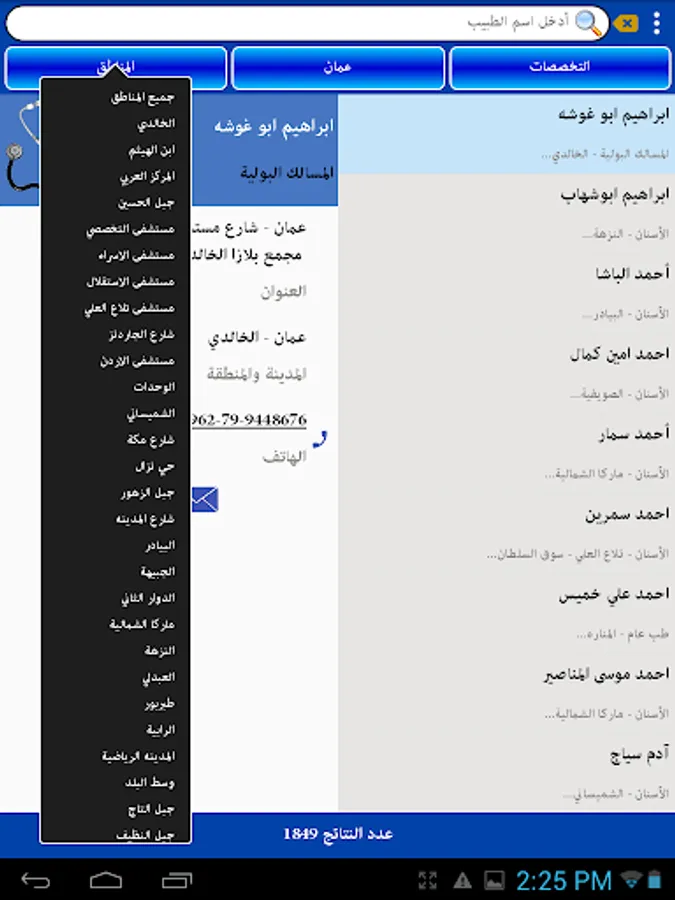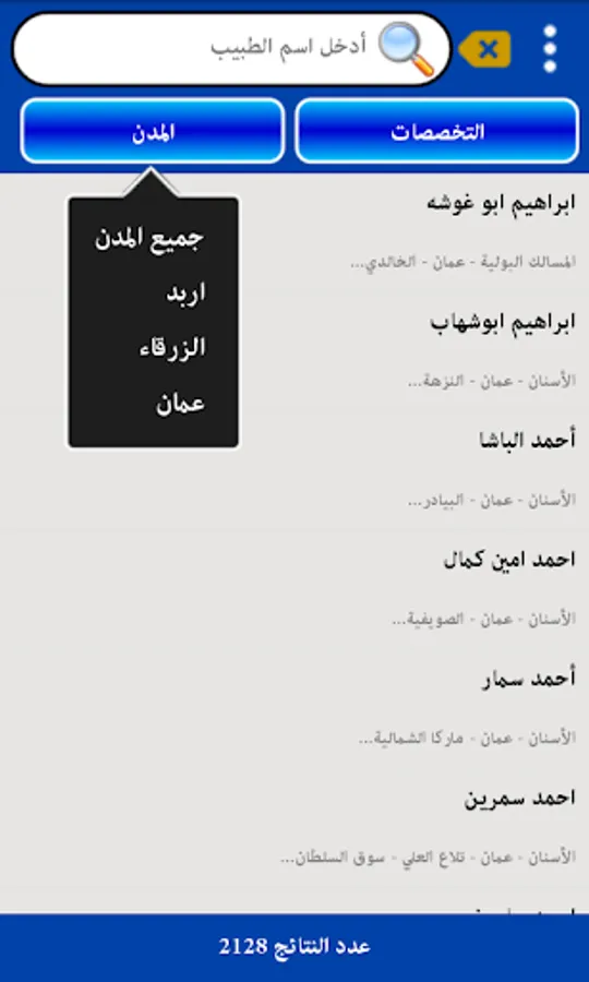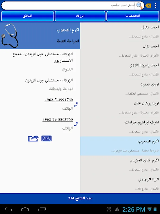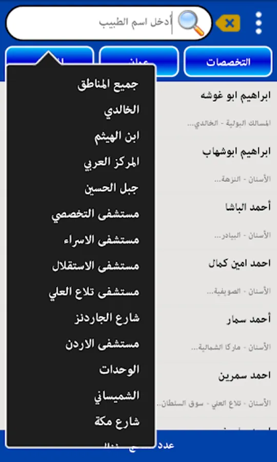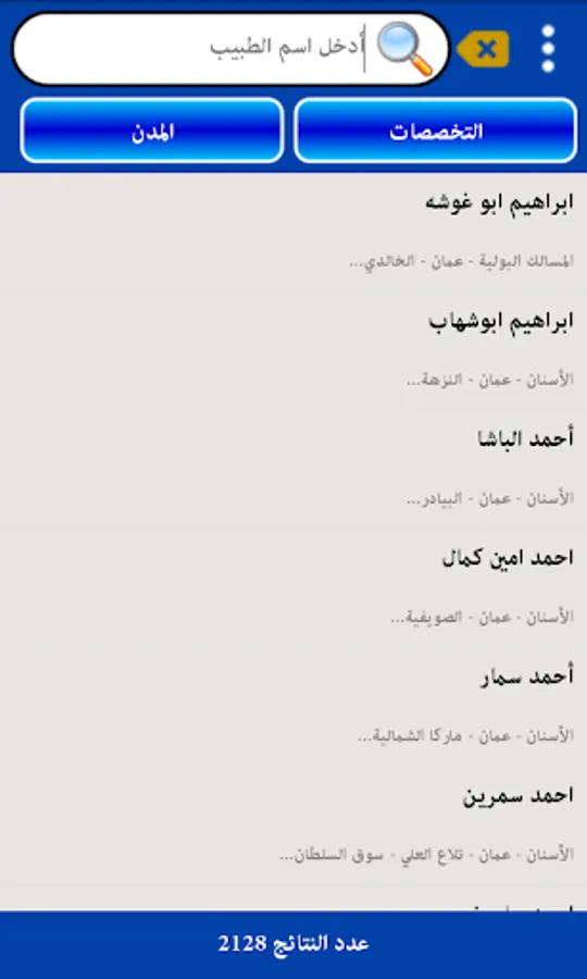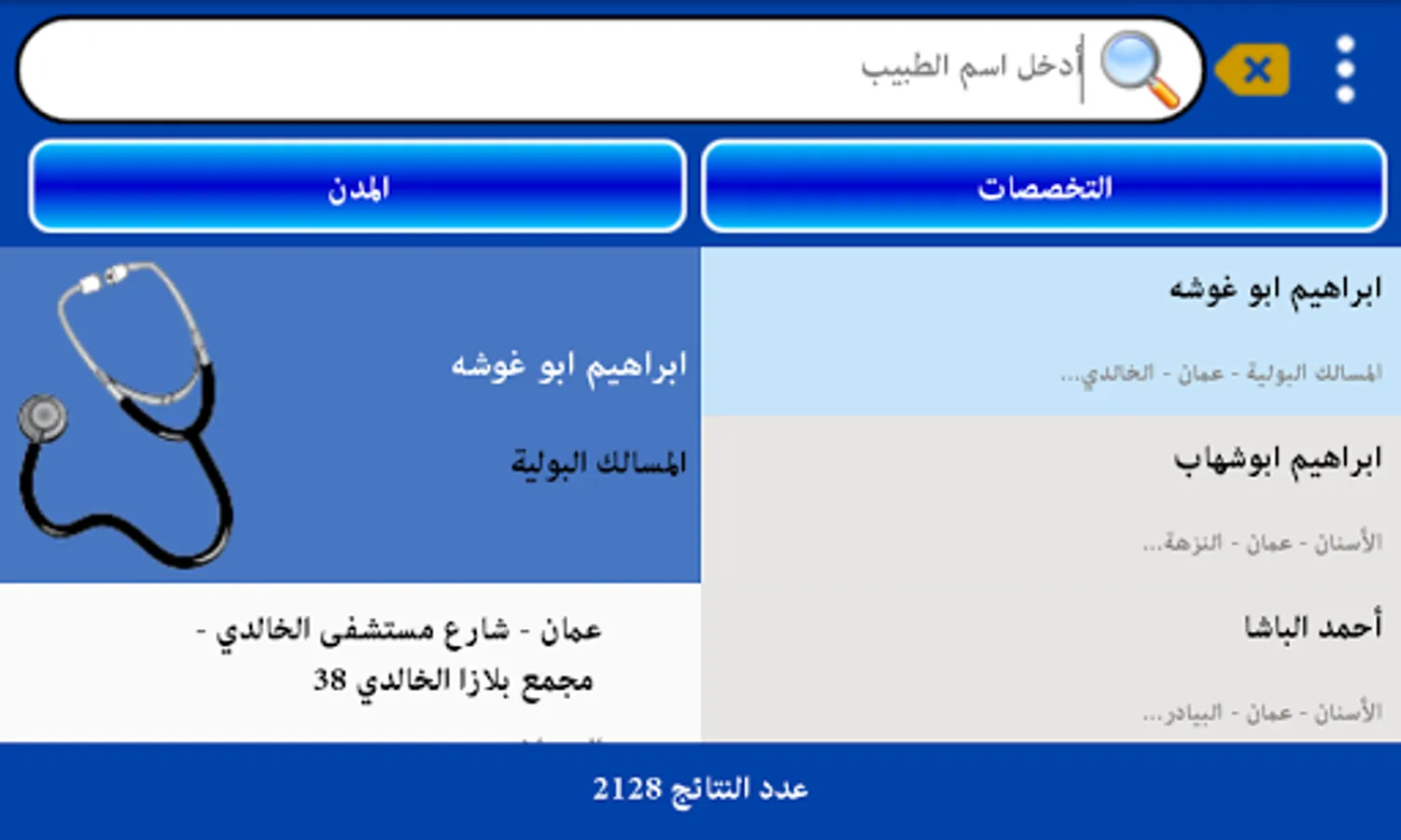 Jordanian doctors guide a program that contains an updated list of addresses and phone numbers of a large group of private doctors' offices in the city of Amman and Zarqa and Irbid city, the program also provides the ability to search by name, competence and the city and the region.
