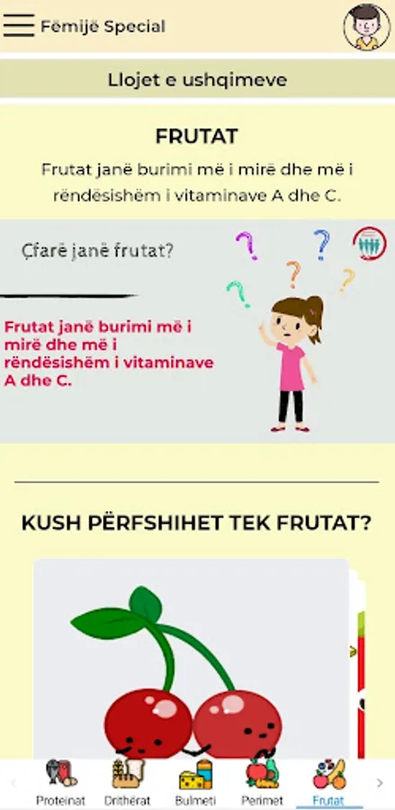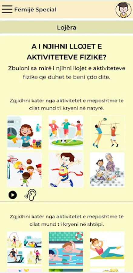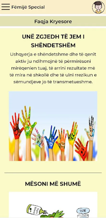 The "Special Children" application is designed for all children with disabilities from the age of 6-16 and aims to inform and raise awareness of these children about healthy behaviors. The application provides information on the great value and importance of healthy nutrition for the good health and well-being of children. This application aims to motivate and encourage them to be as active as possible in physical activities and exercises through information and interactive multimedia. The application was developed within the project "Schools for Health", which is a project of the Swiss Agency for Development and Cooperation (SDC), implemented by the organization "Save the Children".