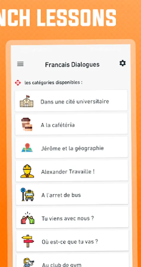 This french dialogue audio offline mp3 app has more than 28 french dialogue categories such as