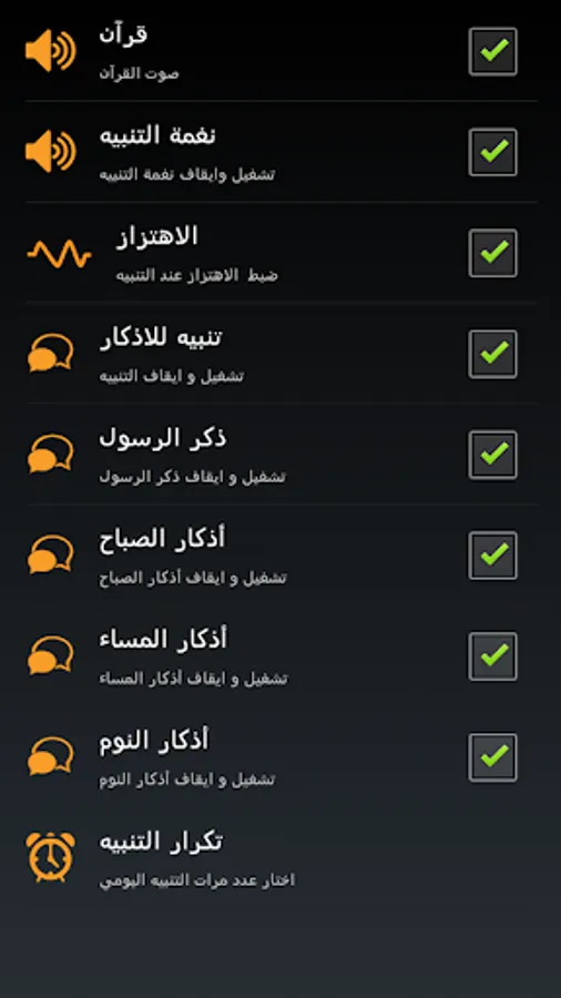 كما يحتوي على تذكير يومي عن طريق تفعيل التنبيه للاذكار والتحكم في الصوت والنغمه للتنبيه كما يحتوي على امكانية التواصل مع مصمم التطبيق لإضافة بعض الملحوظات والتعليقات التي تهمنا.
