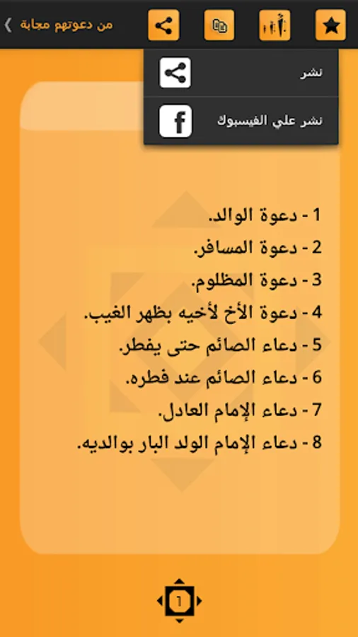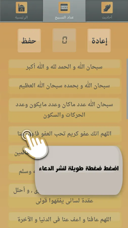 يحتوي ايضا على امكانية نشر الدعاء أو الحديث كما يحتوي على امكانية نسخ الدعاء لإرساله لأي شخص.