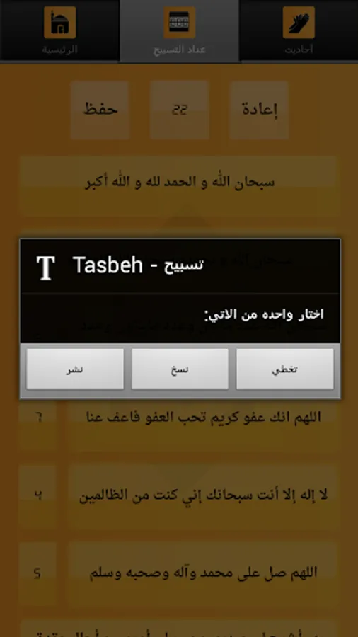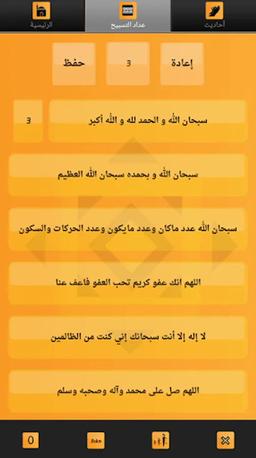 يعتبر تطبيق Tasbeh - تسبيح هو الاول من نوعه الذي يضم أذكار للمسلم وأحاديث نبويه وادعيه من القرآن وعداد للتسبيح.
