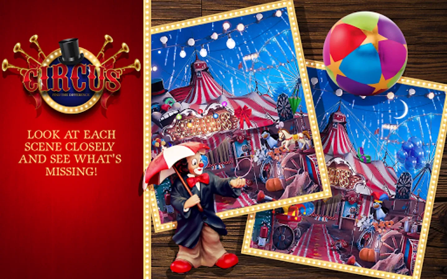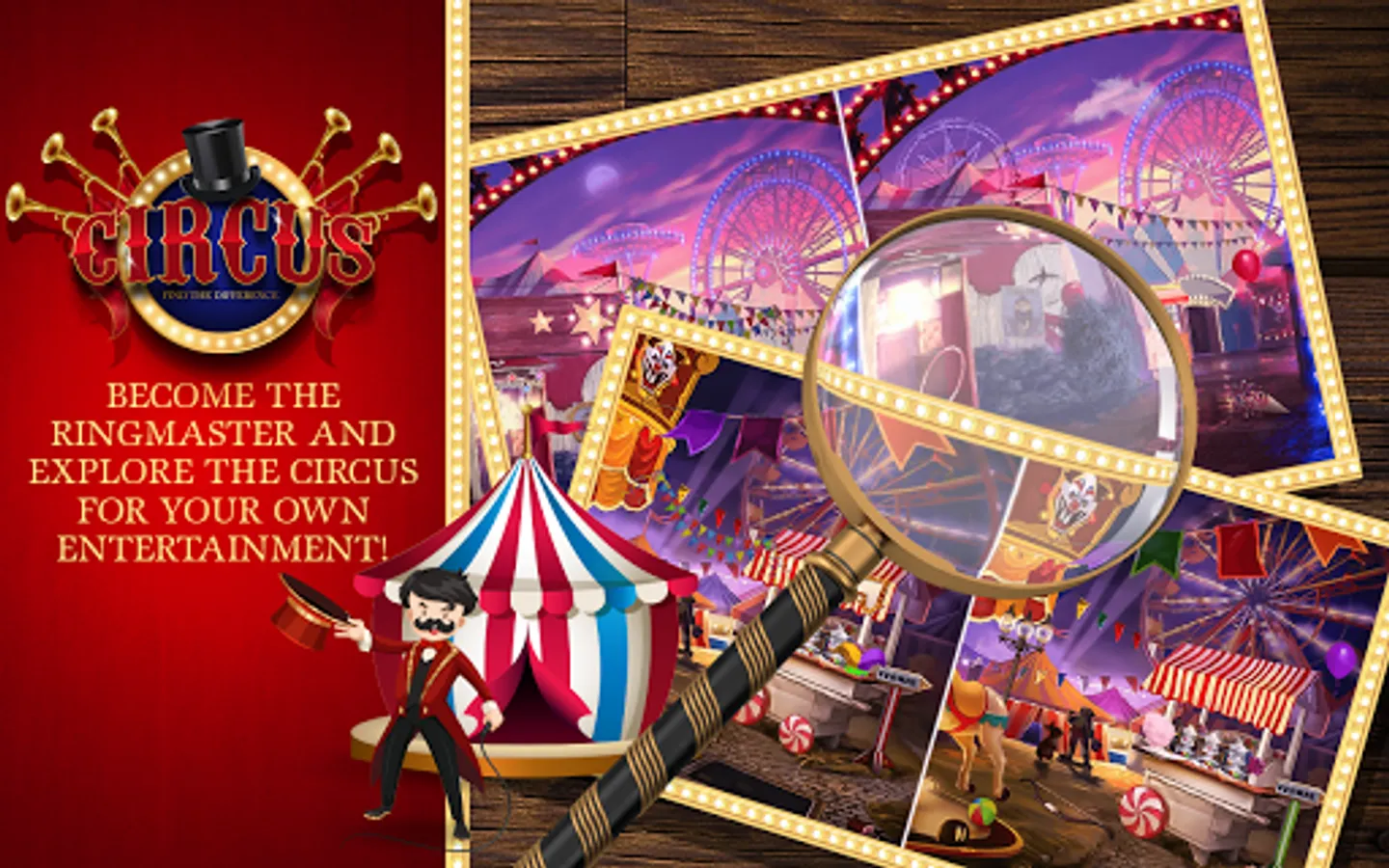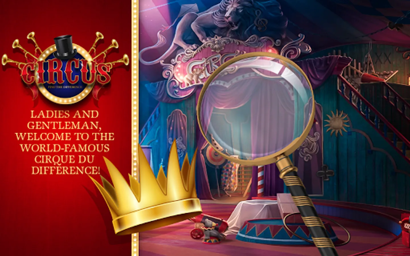 Welcome to the infamous spot the difference “circus” and get ready to become “the greatest showman” ever! If you've been a fan of “carnival games” since your childhood and the taste of cotton candy is taking you back, Circus Conquest Find The Difference will only enrich your experience and prove to be one of the biggest “entertainment games” ever! Other “difference games” don't have as many features and beautiful scenes and this unique “circus game” of ours! Experience the carnival magic, “find the differences 500” in all of the scenes without missing a thing and become a true circus ringmaster, ready to solve all the puzzles that this spot the differences game has to offer. Download the most exciting cirque what's the difference game and start playing fun “search games”!