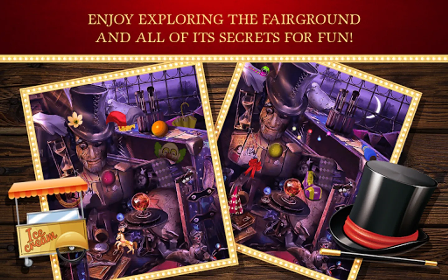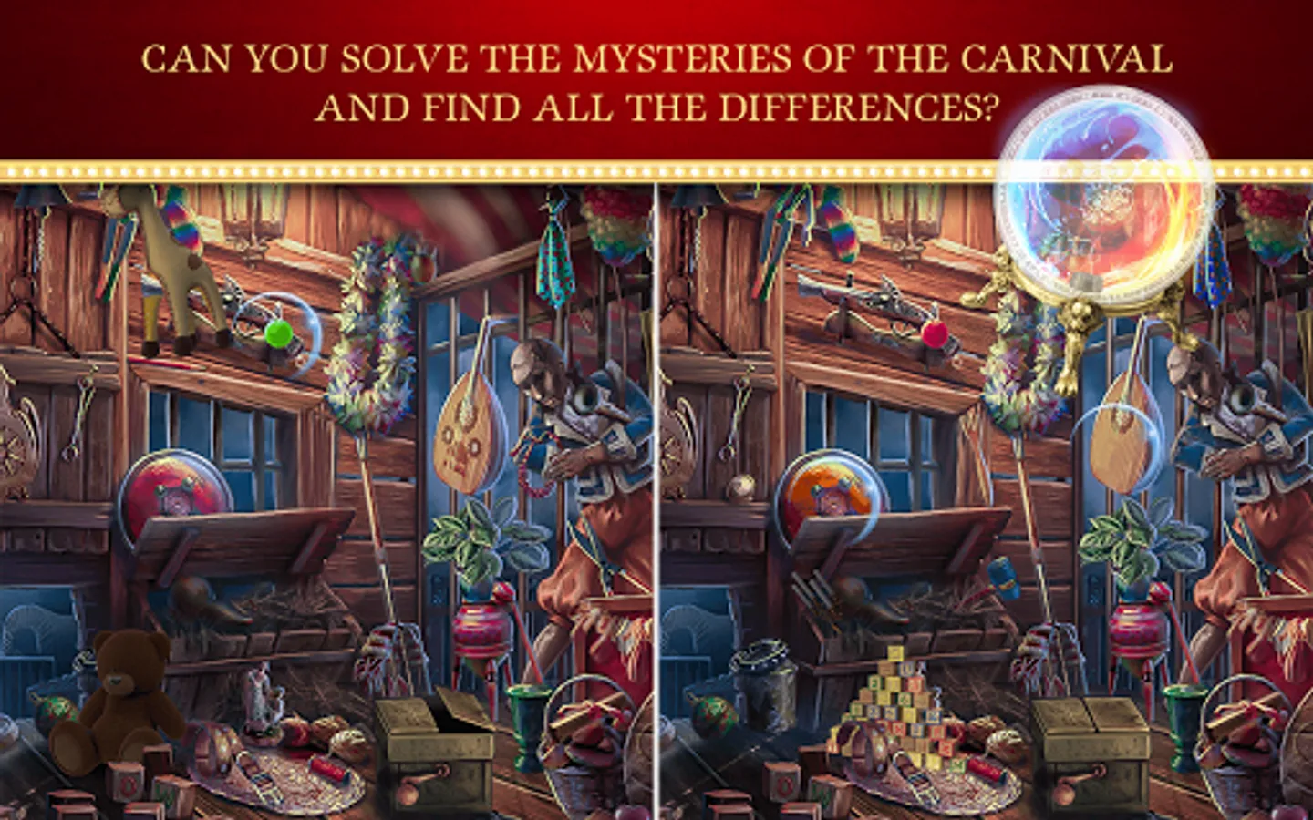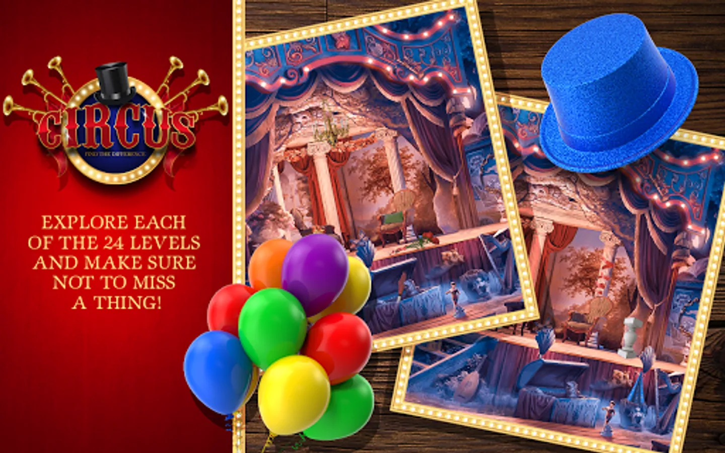 Welcome to the infamous spot the difference “circus” and get ready to become “the greatest showman” ever! If you've been a fan of “carnival games” since your childhood and the taste of cotton candy is taking you back, Circus Conquest Find The Difference will only enrich your experience and prove to be one of the biggest “entertainment games” ever! Other “difference games” don't have as many features and beautiful scenes and this unique “circus game” of ours! Experience the carnival magic, “find the differences 500” in all of the scenes without missing a thing and become a true circus ringmaster, ready to solve all the puzzles that this spot the differences game has to offer. Download the most exciting cirque what's the difference game and start playing fun “search games”!